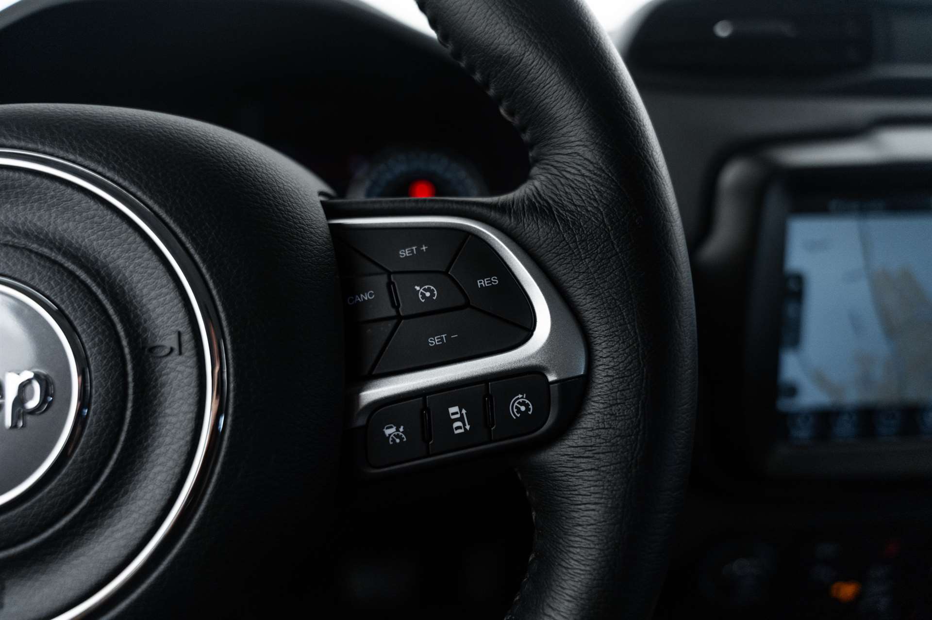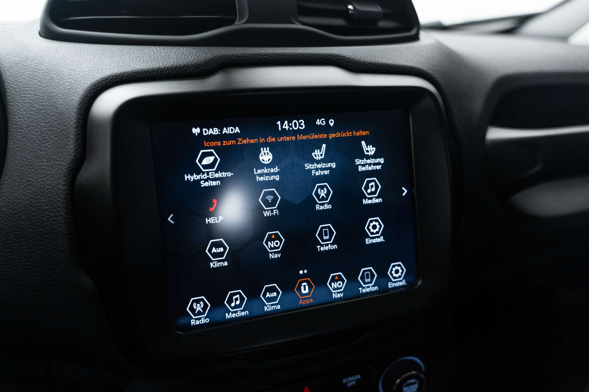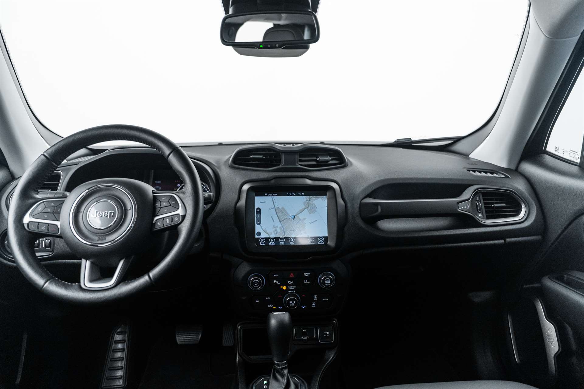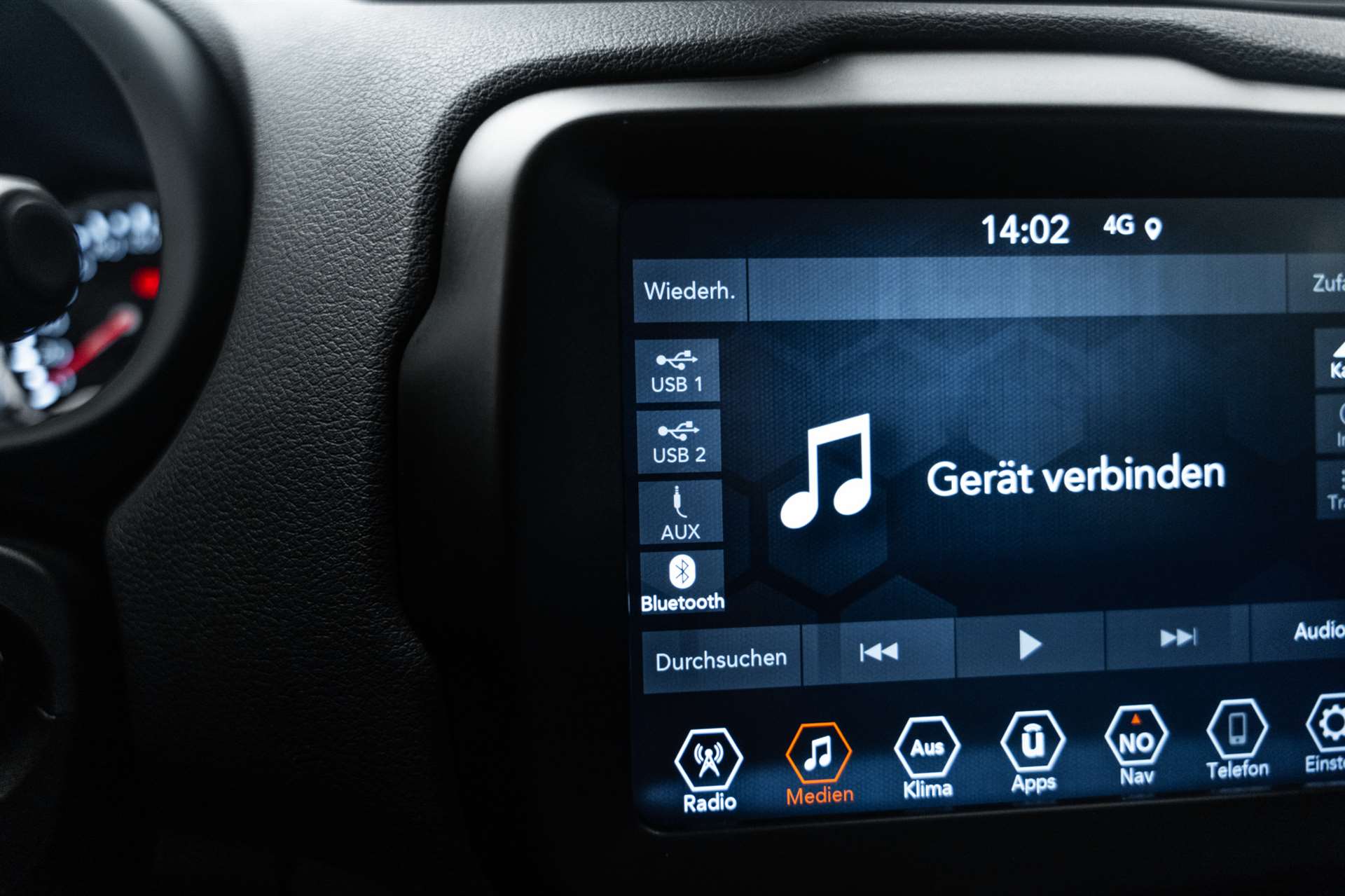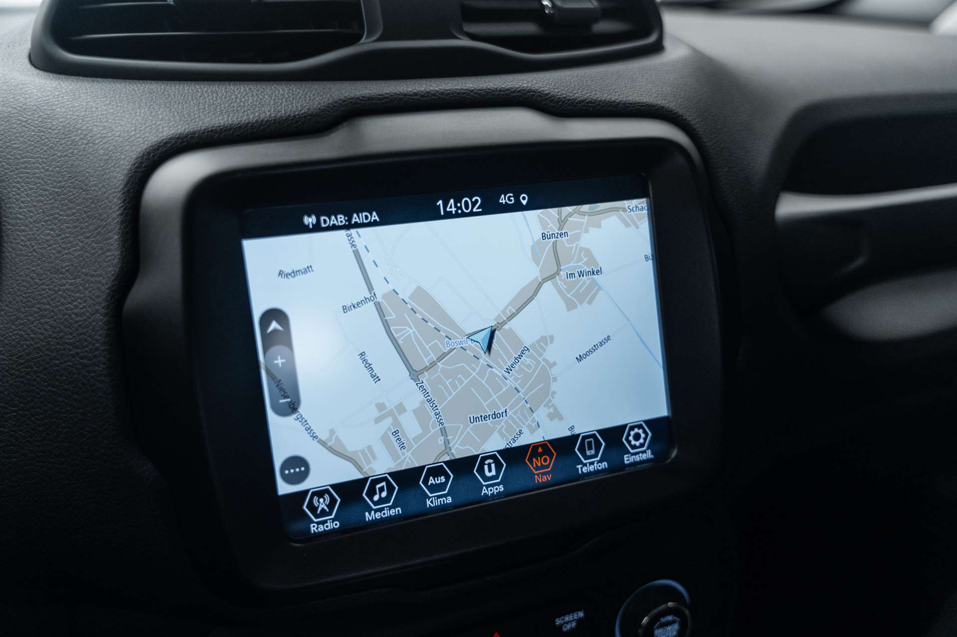 Airbag: Airbag Beifahrer deaktivierbar, Airbag: Airbags der neusten Generation (Front, Seiten, Kopf), Anhängerstabilisierung (gleicht Schwankbewegungen des Anhängers aus), Antiblockiersystem (ABS), Assist: All Speed Traction Control, Assist: Geschwindigkeitsbegrenzer, Assist: Notbremssystem (Brake Assistance System), Assist: ParkView Rückfahrkamera mit dynamischen Führungslinien, Assist: Spurhalteassistent Lane Assist, Assist: Tempomat, Elektrisch verstellbare und beheizte Aussenspiegel, Elektrische Fensterheber vorne, Elektronische Parkbremse, Elektronisches Stabilitätsprogramm (ESP), Garantie: 3 Jahre oder 100'000 km, Garantie: Durchrostungsgarantie 7 Jahre, Gepäckraumabdeckung, Getriebe: 7-Gang DDCT, ISOFIX Kindersitzvorrichtung, Klima: Automatische 2-Zonen-Klimaanlage, Lackierung: Pastell Lackierung Solid Black, Lenkrad: Beheiztes, höhen- und tiefenverstellbares Lederlenkrad, Lenkrad: Lenkrad mit integrierten Bedienelementen für Audiosystem, Licht: LED-Innenbeleuchtung, Licht: Scheinwerfer mit Dämmerungsfunktion, Media: Apple Carplay & Android Auto, Media: Kombiinstrument 10,25 Zoll-Digitalanzeige, Media: Soundsystem mit 6 Lautsprechern, Media: Uconnect Infotainment mit 10" Touchscreen, Digitalradio (DAB) und Bluetooth, Media: USB-A Anschluss vorne und hinten/USB-C & AUX Anschluss vorne, Polster: Stoffsitze, Räder: 16" Aluminiumfelgen Renegade, Räder: Fix & Go Reifenreparaturkit, Räder: Reifendruck-Kontrollsystem, Scheibenwischer mit Regensensoren, Scheibenwischerenteiser, Servolenkung, Sitze: Fahrersitz 6-fach und Beifahrersitz 4-fach manuell einstellbar, Sitze: Fahrersitz mit 2-facher elektrischer Einstellung der Lordosenstütze, Sitze: Sitzheizung vorne, Spiegelkappen Schwarz, Umkehrbarer und höhenverstellbarer Kofferraum-Ladeboden, Wegfahrsperre elektronisch, Zentralverriegelung mit Fernbedienung