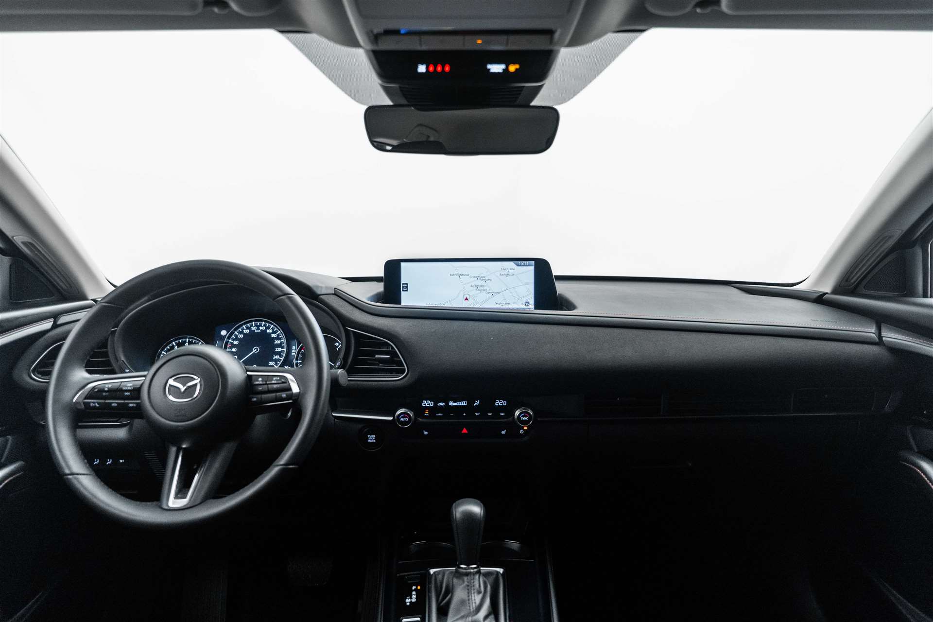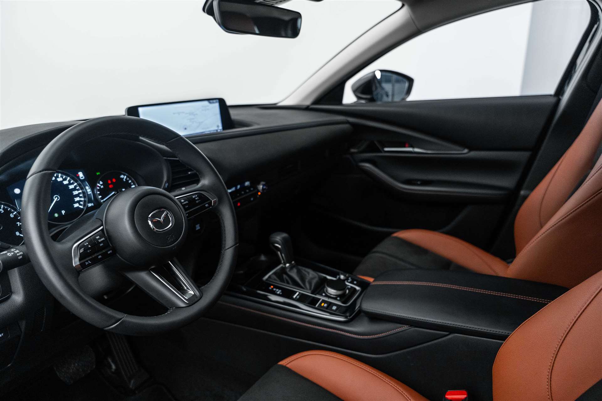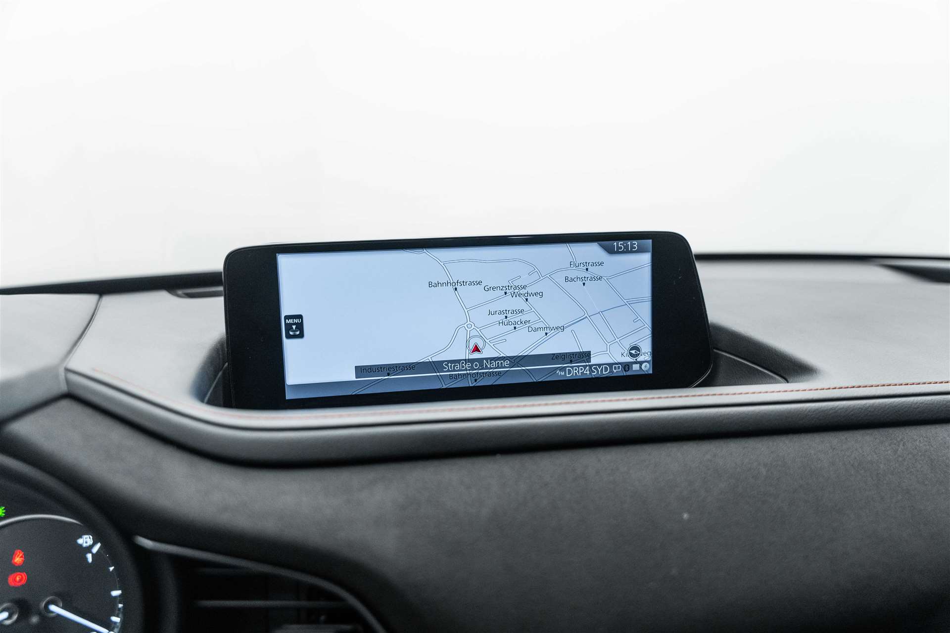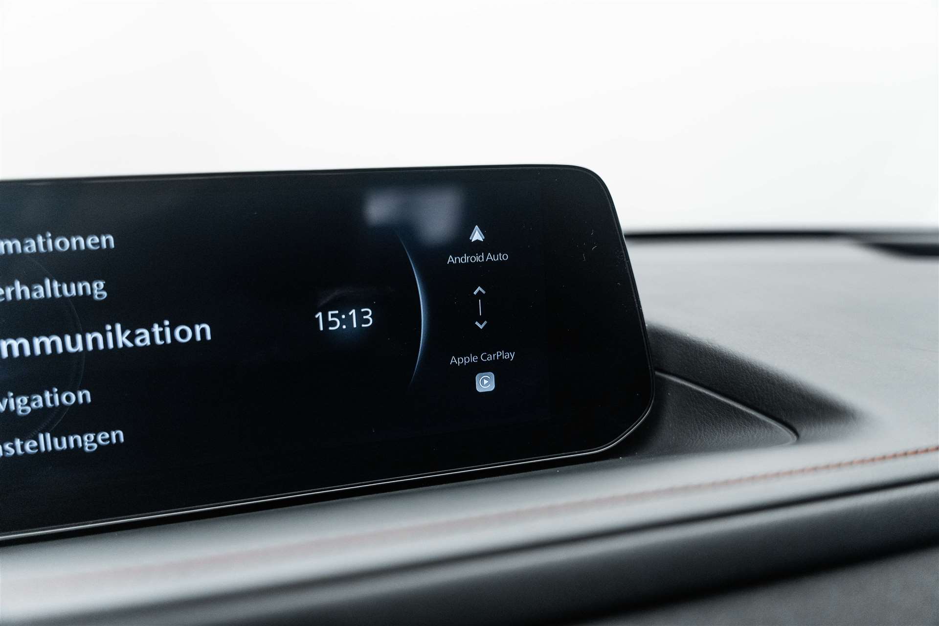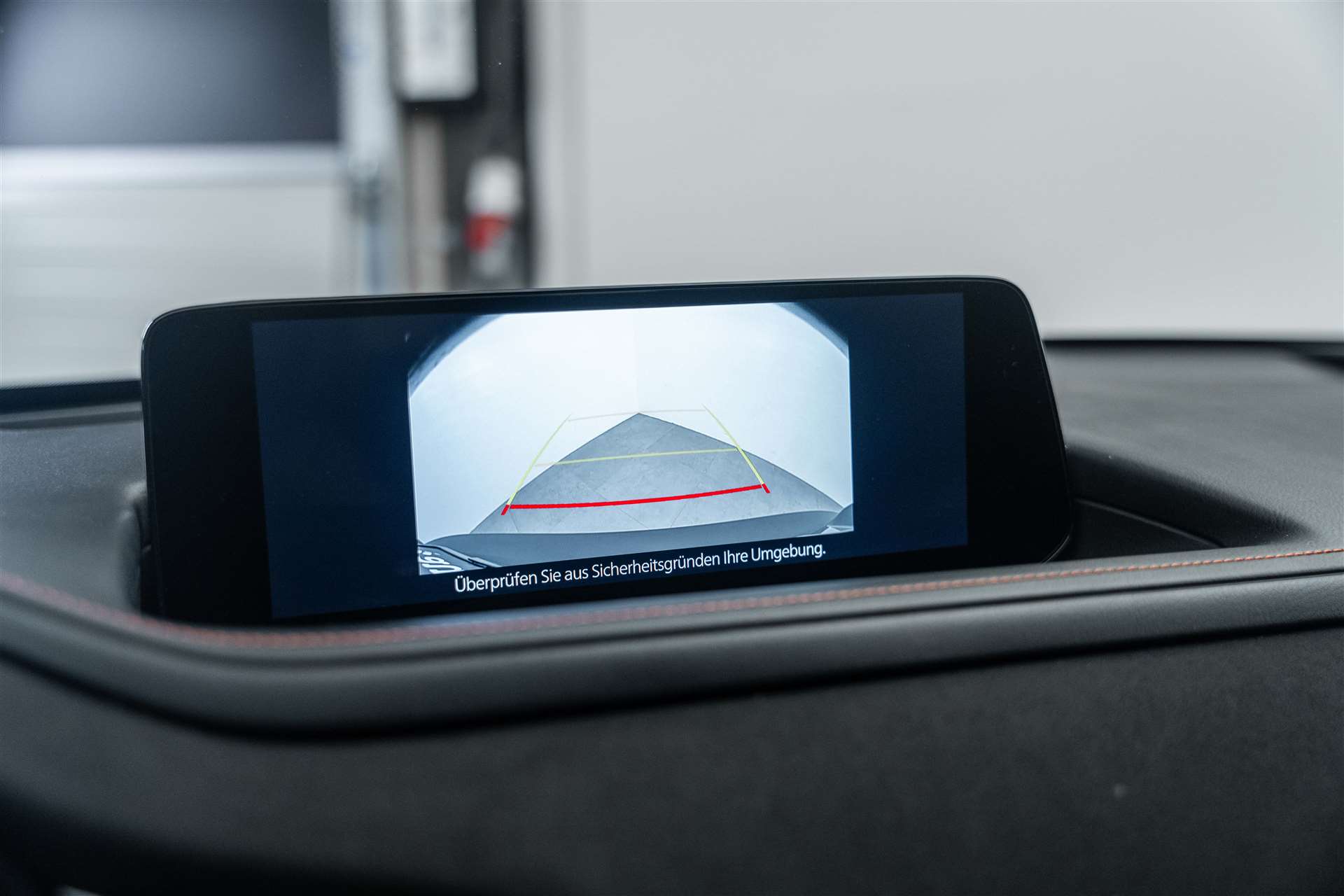 Ablagetasche (Rückseite Beifahrersitz), ABS, Airbag: Airbag Fahrer und Beifahrer, Airbag: Fahrer-Knie-Airbag, Airbag: Seitenairbags vorne, Airbag: Vorhang vorn-hinten, Alarmanlage, Assist: Adaptive Geschwindigkeitsautomatik MRCC (Mazda Radar Cruise Control), Assist: Aufmerksamkeitswarner DAA (Driver Attention Alert), Assist: City-Notbremsassistent SCBS mit Fussgänger- und Fahrraderkennung, Assist: Dynamische Stabilitätskontrolle (DSC) und Traktionskontrolle (TCS), Assist: Einparkhilfe mit Parksensoren hinten, Assist: Einparkhilfe mit Parksensoren vorne, Assist: Elektronische Parkbremse mit Auto-Hold-Funktion und Berganfahrhilfe, Assist: Intelligente Geschwindigkeitsautomatik und Geschwindigkeitsbegrenzer mit Verkehrszeichen, Assist: Pre-Crash Safety mit aktivem Bremseingriff SBS (Smart Brake Support), Assist: Rückfahr-Querverkehrswarner (RCTA, Rear Cross Traffic Alert), Assist: Rückfahrkamera, Assist: Spurhalteassistent LAS (Lane-keep Assist System) mit aktiver Lenkunterstützung, Assist: Spurwechselassistent (BSM, Blind Spot Monitoring) mit Totwinkelwarner, Assist: Verkehrszeichenerkennung (TSR, Traffic Sign Recognition), Aussenspiegel automatisch abblendend auf Fahrerseite, Aussenspiegel beheizbar und automatisch einklappbar, Aussenspiegel in Brilliant Black, Aussenspiegel rechts mit automatischer Absenkfunktion zum Rückwärtsfahren, Blenden im Seitenfensterbereich in Brilliant Black, Bordcomputer, Dachheckspoiler in Brilliant Black, Dekor: Interieur schwarz mit Ziernähten in Terracotta und Dekorelementen in Gunmetal Black, Dunkel getönte Scheiben hinten (Privacy Glass), eCall, Elektrische Fensterheber vorn und hinten mit Automatikfunktion, Elektrische Heckklappe, Fahrwerk: G-Vectoring Control Plus, die Fahrdynamikregelung von Mazda, Garantie: 6 Jahre oder 150'000 km, Getriebe: 6-Gang-Getriebe, Head-up-Display mit Projektion auf die Windschutzscheibe, i-stop, das intelligente Stopp-Start-System von Mazda, Innenspiegel automatisch abblendbar, Isofix-Kindersitzverankerungen (2x), Keyless Entry mit Smart Key, Klima: 2-Zonen-Klimaautomatik mit Ventilation hinten, Kofferraumorganisator Smart Cargo System (SCS), Kosmetikspiegel auf Beifahrerseite und Fahrerseite, beide beleuchtet, Kühlergrill in Brilliant Black, Kühlergrilleinfassung in Black Chrome, Lackierung: Uni-Lackierung, LED-Innenbeleuchtung, Lederlenkrad und -schaltknauf, Lenkrad: Lenkrad längs- und höhenverstellbar, Lenkrad: Multifunktionslenkrad, Licht: Fernlichtautomatik (HBC, High-Beam Control), Licht: LED-Rückleuchten, Licht: Lichtautomatik, Licht: Scheinwerfer mit Coming-/Leaving-Home-Funktion, Licht: Voll-LED-Scheinwerfer, Mazda M Hybrid, Mild-Hybridsystem (M-HEV) mit Bremsenergie-Rückgewinnung, Media: 12 Lautsprecher, Media: Apple CarPlay wireless und Android Auto wireless, Media: Audiosystem mit DAB+-Radio, 2x USB- C- und 12-V-Anschluss, Media: Bluetooth für Smartphones und Audiogeräte, Media: Bose Premium Surround Sound-System, Media: Instrumentenanzeige mit 7'-TFT-Multidisplay, Media: Mazda Connect mit 10,25"-TFT-Display und Sprachassistent Alexa, Media: Mazda Connected Services, Media: Multi Commander HMI auf der Mittelkonsole, Media: MyMazda App, Media: Navigationssystem, Media: Wireless-Ladestation (für Smartphones mit Qi-Standard), Mittelarmlehne vorne mit Ablagefach, Motor-Startknopf, Polster: Simililedersitze in Terracotta mit Sitzfläche in Leganu schwarz (Wildlederoptik), Räder: Leichtmetallfelgen 18" Farbe Black Metallic 215/55 R18, Räder: Reifendruckkontrollsystem, Räder: Reifenreparatur-Set (Tire Fit), Scheibenwischer mit integrierter Waschdüse, Scheibenwischer mit Regensensor, Servolenkung, Sitze: Beifahrersitz höhenverstellbar, Sitze: Fahrersitz elektrisch verstellbar (5-fach) und mit Memory-Funktion für Sitzeinstellung,, Sitze: Fahrersitz in Höhe und Sitzkissen in Neigung verstellbar, Sitze: Fahrersitz mit einstellbarer Lendenwirbelstütze, Sitze: Rücksitzlehnen getrennt abklappbar 60:40, Sitze: Vordersitze heizbar, Zentralverriegelung mit Fernbedienung