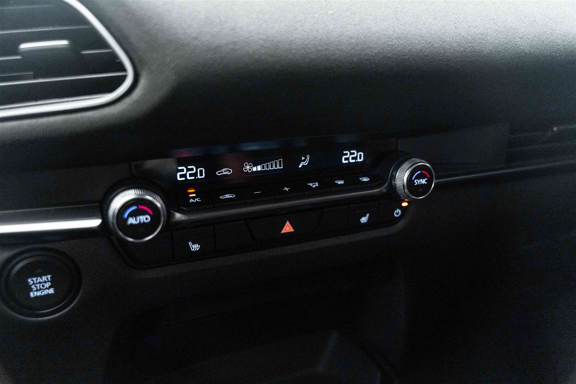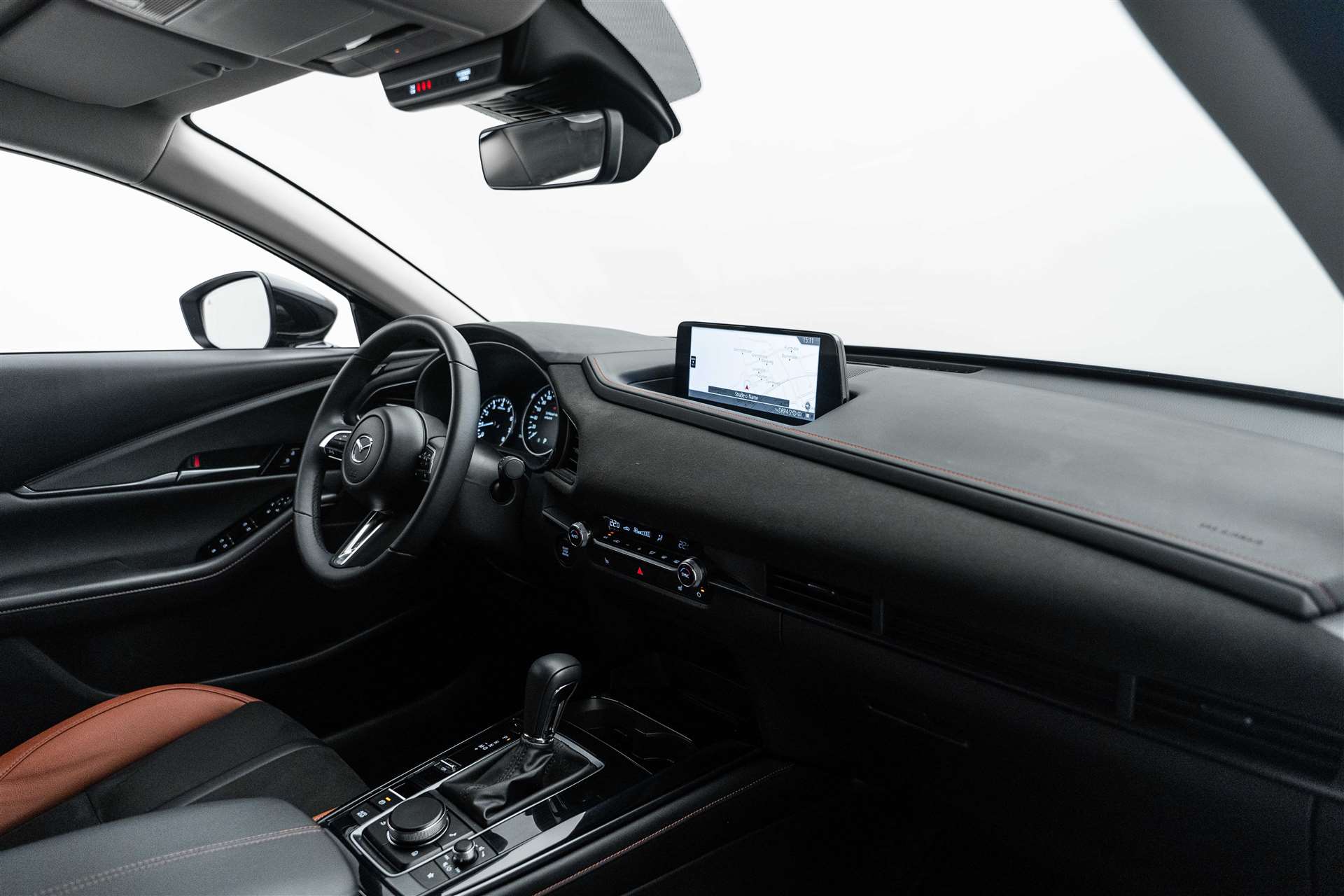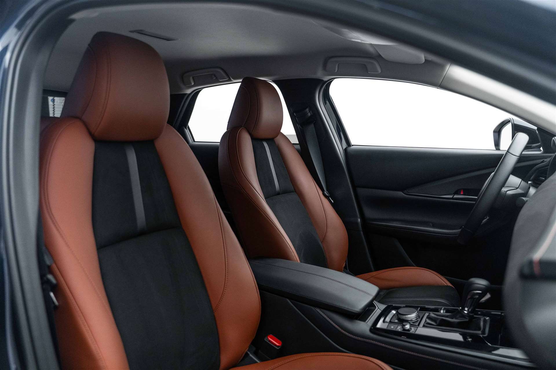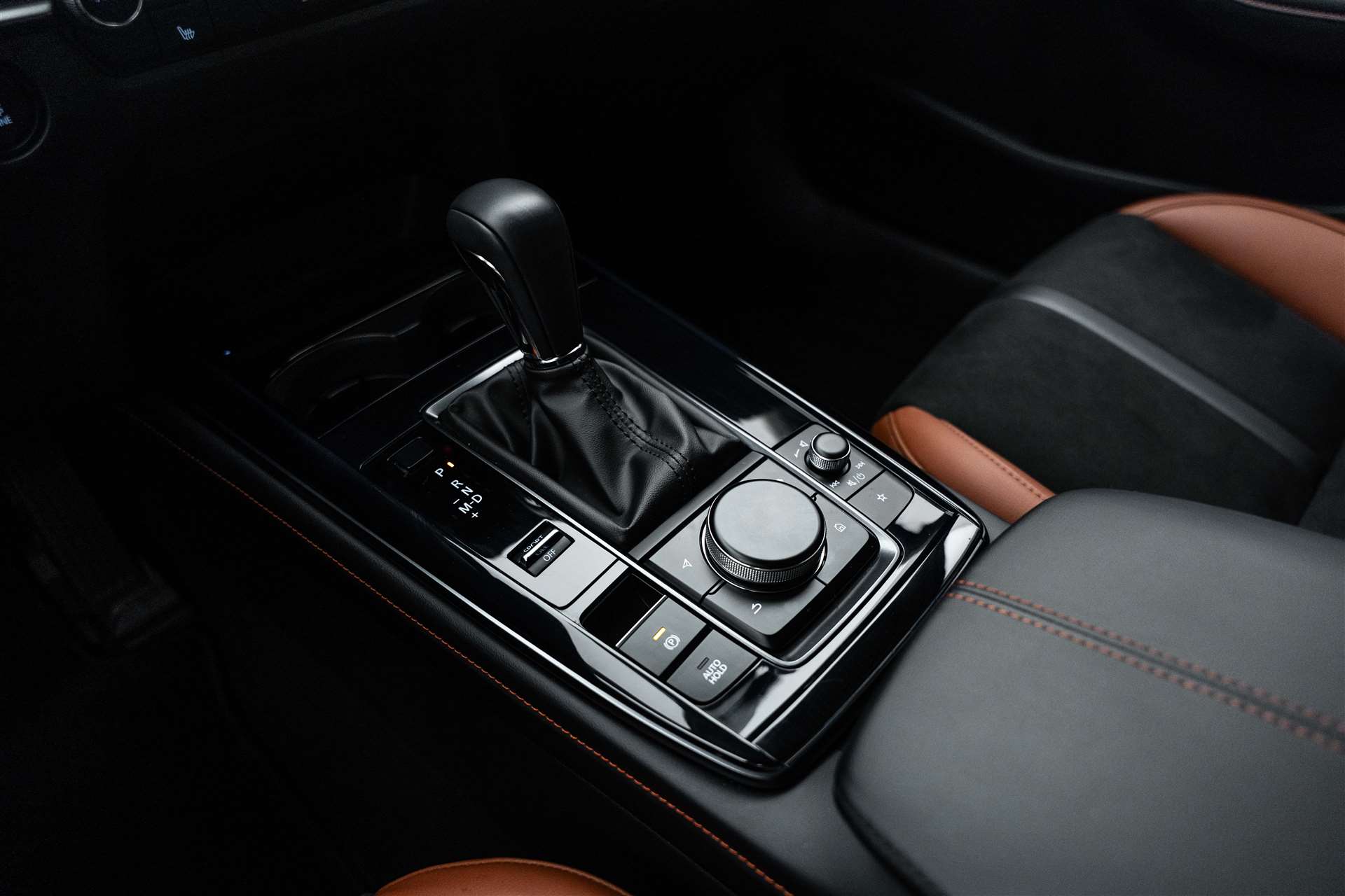 Ablagetasche (Rückseite Beifahrersitz), ABS, Airbag: Airbag Fahrer und Beifahrer, Airbag: Fahrer-Knie-Airbag, Airbag: Seitenairbags vorne, Airbag: Vorhang vorn-hinten, Alarmanlage, Assist: Adaptive Geschwindigkeitsautomatik MRCC (Mazda Radar Cruise Control), Assist: Aufmerksamkeitswarner DAA (Driver Attention Alert), Assist: City-Notbremsassistent SCBS mit Fussgänger- und Fahrraderkennung, Assist: Dynamische Stabilitätskontrolle (DSC) und Traktionskontrolle (TCS), Assist: Einparkhilfe mit Parksensoren hinten, Assist: Einparkhilfe mit Parksensoren vorne, Assist: Elektronische Parkbremse mit Auto-Hold-Funktion und Berganfahrhilfe, Assist: Intelligente Geschwindigkeitsautomatik und Geschwindigkeitsbegrenzer mit Verkehrszeichen, Assist: Pre-Crash Safety mit aktivem Bremseingriff SBS (Smart Brake Support), Assist: Rückfahr-Querverkehrswarner (RCTA, Rear Cross Traffic Alert), Assist: Rückfahrkamera, Assist: Spurhalteassistent LAS (Lane-keep Assist System) mit aktiver Lenkunterstützung, Assist: Spurwechselassistent (BSM, Blind Spot Monitoring) mit Totwinkelwarner, Assist: Verkehrszeichenerkennung (TSR, Traffic Sign Recognition), Aussenspiegel automatisch abblendend auf Fahrerseite, Aussenspiegel beheizbar und automatisch einklappbar, Aussenspiegel in Brilliant Black, Aussenspiegel rechts mit automatischer Absenkfunktion zum Rückwärtsfahren, Blenden im Seitenfensterbereich in Brilliant Black, Bordcomputer, Dachheckspoiler in Brilliant Black, Dekor: Interieur schwarz mit Ziernähten in Terracotta und Dekorelementen in Gunmetal Black, Dunkel getönte Scheiben hinten (Privacy Glass), eCall, Elektrische Fensterheber vorn und hinten mit Automatikfunktion, Elektrische Heckklappe, Fahrwerk: G-Vectoring Control Plus, die Fahrdynamikregelung von Mazda, Garantie: 6 Jahre oder 150'000 km, Getriebe: 6-Gang-Getriebe, Head-up-Display mit Projektion auf die Windschutzscheibe, i-stop, das intelligente Stopp-Start-System von Mazda, Innenspiegel automatisch abblendbar, Isofix-Kindersitzverankerungen (2x), Keyless Entry mit Smart Key, Klima: 2-Zonen-Klimaautomatik mit Ventilation hinten, Kofferraumorganisator Smart Cargo System (SCS), Kosmetikspiegel auf Beifahrerseite und Fahrerseite, beide beleuchtet, Kühlergrill in Brilliant Black, Kühlergrilleinfassung in Black Chrome, Lackierung: Uni-Lackierung, LED-Innenbeleuchtung, Lederlenkrad und -schaltknauf, Lenkrad: Lenkrad längs- und höhenverstellbar, Lenkrad: Multifunktionslenkrad, Licht: Fernlichtautomatik (HBC, High-Beam Control), Licht: LED-Rückleuchten, Licht: Lichtautomatik, Licht: Scheinwerfer mit Coming-/Leaving-Home-Funktion, Licht: Voll-LED-Scheinwerfer, Mazda M Hybrid, Mild-Hybridsystem (M-HEV) mit Bremsenergie-Rückgewinnung, Media: 12 Lautsprecher, Media: Apple CarPlay wireless und Android Auto wireless, Media: Audiosystem mit DAB+-Radio, 2x USB- C- und 12-V-Anschluss, Media: Bluetooth für Smartphones und Audiogeräte, Media: Bose Premium Surround Sound-System, Media: Instrumentenanzeige mit 7'-TFT-Multidisplay, Media: Mazda Connect mit 10,25"-TFT-Display und Sprachassistent Alexa, Media: Mazda Connected Services, Media: Multi Commander HMI auf der Mittelkonsole, Media: MyMazda App, Media: Navigationssystem, Media: Wireless-Ladestation (für Smartphones mit Qi-Standard), Mittelarmlehne vorne mit Ablagefach, Motor-Startknopf, Polster: Simililedersitze in Terracotta mit Sitzfläche in Leganu schwarz (Wildlederoptik), Räder: Leichtmetallfelgen 18" Farbe Black Metallic 215/55 R18, Räder: Reifendruckkontrollsystem, Räder: Reifenreparatur-Set (Tire Fit), Scheibenwischer mit integrierter Waschdüse, Scheibenwischer mit Regensensor, Servolenkung, Sitze: Beifahrersitz höhenverstellbar, Sitze: Fahrersitz elektrisch verstellbar (5-fach) und mit Memory-Funktion für Sitzeinstellung,, Sitze: Fahrersitz in Höhe und Sitzkissen in Neigung verstellbar, Sitze: Fahrersitz mit einstellbarer Lendenwirbelstütze, Sitze: Rücksitzlehnen getrennt abklappbar 60:40, Sitze: Vordersitze heizbar, Zentralverriegelung mit Fernbedienung