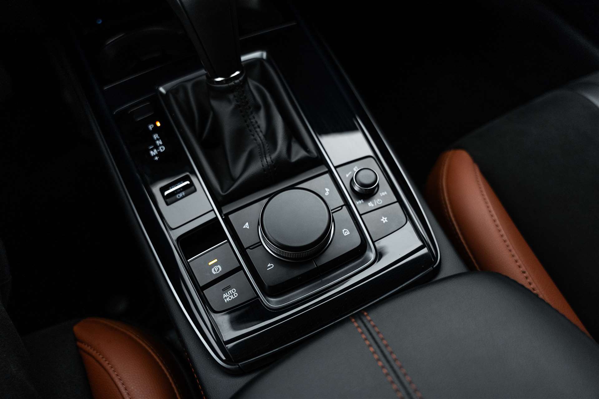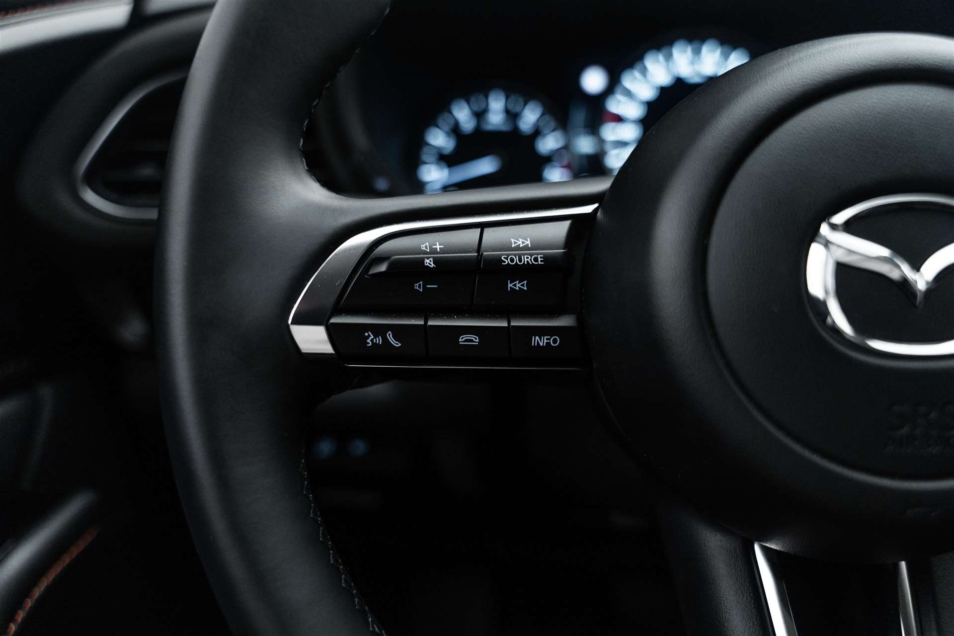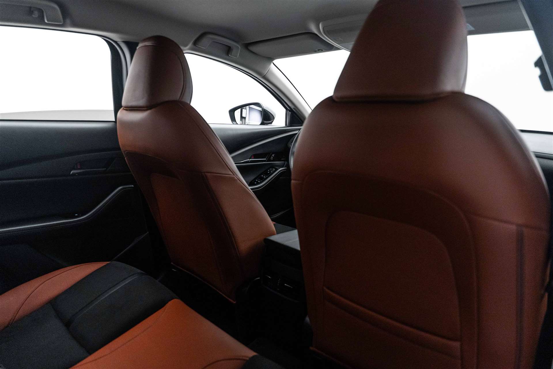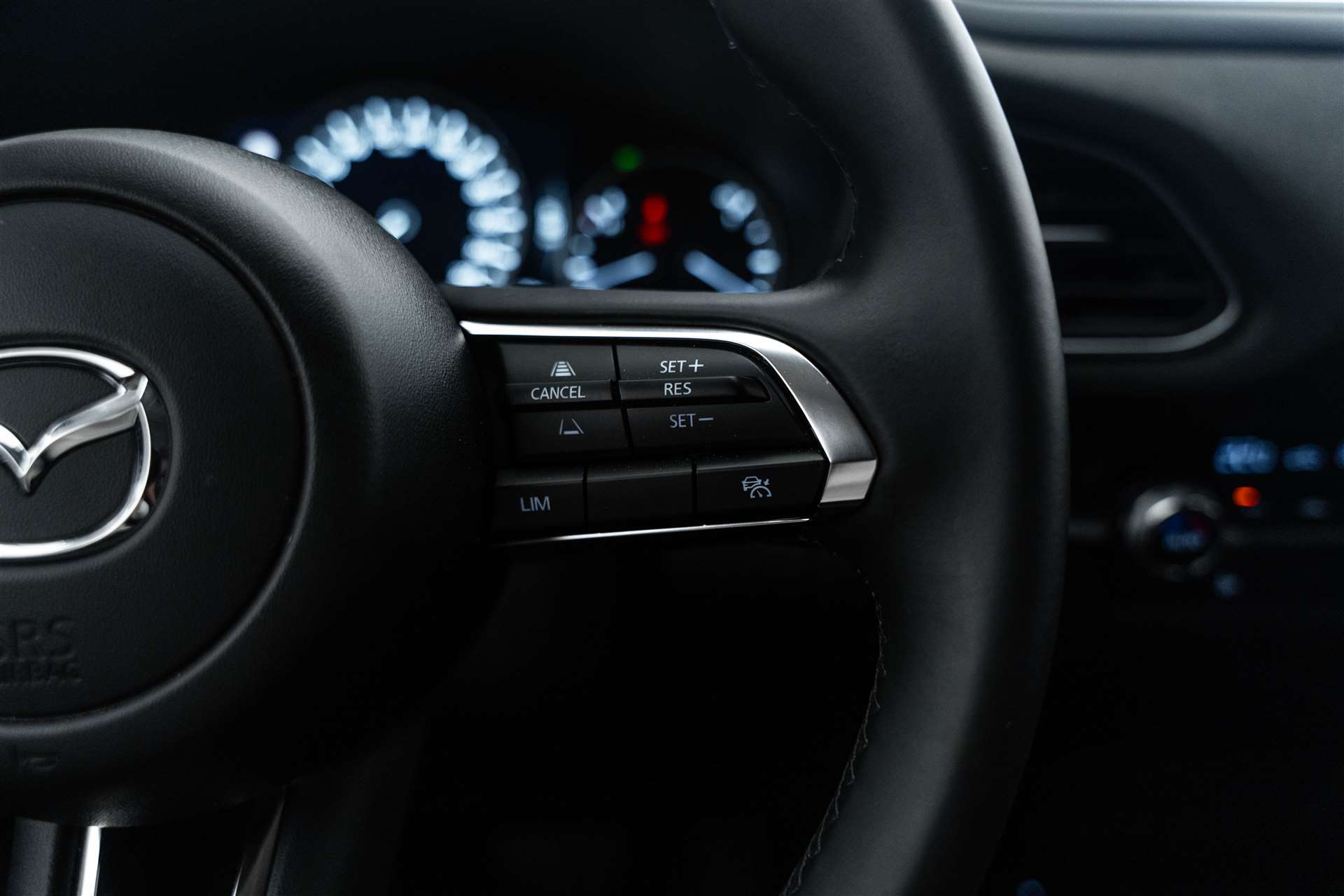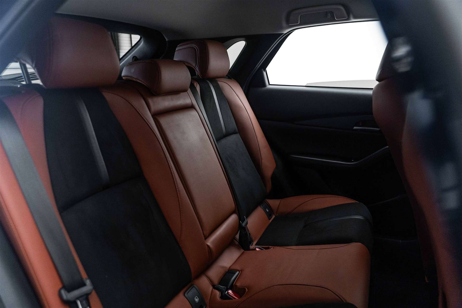 Ablagetasche (Rückseite Beifahrersitz), ABS, Airbag: Airbag Fahrer und Beifahrer, Airbag: Fahrer-Knie-Airbag, Airbag: Seitenairbags vorne, Airbag: Vorhang vorn-hinten, Alarmanlage, Assist: Adaptive Geschwindigkeitsautomatik MRCC (Mazda Radar Cruise Control), Assist: Aufmerksamkeitswarner DAA (Driver Attention Alert), Assist: City-Notbremsassistent SCBS mit Fussgänger- und Fahrraderkennung, Assist: Dynamische Stabilitätskontrolle (DSC) und Traktionskontrolle (TCS), Assist: Einparkhilfe mit Parksensoren hinten, Assist: Einparkhilfe mit Parksensoren vorne, Assist: Elektronische Parkbremse mit Auto-Hold-Funktion und Berganfahrhilfe, Assist: Intelligente Geschwindigkeitsautomatik und Geschwindigkeitsbegrenzer mit Verkehrszeichen, Assist: Pre-Crash Safety mit aktivem Bremseingriff SBS (Smart Brake Support), Assist: Rückfahr-Querverkehrswarner (RCTA, Rear Cross Traffic Alert), Assist: Rückfahrkamera, Assist: Spurhalteassistent LAS (Lane-keep Assist System) mit aktiver Lenkunterstützung, Assist: Spurwechselassistent (BSM, Blind Spot Monitoring) mit Totwinkelwarner, Assist: Verkehrszeichenerkennung (TSR, Traffic Sign Recognition), Aussenspiegel automatisch abblendend auf Fahrerseite, Aussenspiegel beheizbar und automatisch einklappbar, Aussenspiegel in Brilliant Black, Aussenspiegel rechts mit automatischer Absenkfunktion zum Rückwärtsfahren, Blenden im Seitenfensterbereich in Brilliant Black, Bordcomputer, Dachheckspoiler in Brilliant Black, Dekor: Interieur schwarz mit Ziernähten in Terracotta und Dekorelementen in Gunmetal Black, Dunkel getönte Scheiben hinten (Privacy Glass), eCall, Elektrische Fensterheber vorn und hinten mit Automatikfunktion, Elektrische Heckklappe, Fahrwerk: G-Vectoring Control Plus, die Fahrdynamikregelung von Mazda, Garantie: 6 Jahre oder 150'000 km, Getriebe: 6-Gang-Getriebe, Head-up-Display mit Projektion auf die Windschutzscheibe, i-stop, das intelligente Stopp-Start-System von Mazda, Innenspiegel automatisch abblendbar, Isofix-Kindersitzverankerungen (2x), Keyless Entry mit Smart Key, Klima: 2-Zonen-Klimaautomatik mit Ventilation hinten, Kofferraumorganisator Smart Cargo System (SCS), Kosmetikspiegel auf Beifahrerseite und Fahrerseite, beide beleuchtet, Kühlergrill in Brilliant Black, Kühlergrilleinfassung in Black Chrome, Lackierung: Uni-Lackierung, LED-Innenbeleuchtung, Lederlenkrad und -schaltknauf, Lenkrad: Lenkrad längs- und höhenverstellbar, Lenkrad: Multifunktionslenkrad, Licht: Fernlichtautomatik (HBC, High-Beam Control), Licht: LED-Rückleuchten, Licht: Lichtautomatik, Licht: Scheinwerfer mit Coming-/Leaving-Home-Funktion, Licht: Voll-LED-Scheinwerfer, Mazda M Hybrid, Mild-Hybridsystem (M-HEV) mit Bremsenergie-Rückgewinnung, Media: 12 Lautsprecher, Media: Apple CarPlay wireless und Android Auto wireless, Media: Audiosystem mit DAB+-Radio, 2x USB- C- und 12-V-Anschluss, Media: Bluetooth für Smartphones und Audiogeräte, Media: Bose Premium Surround Sound-System, Media: Instrumentenanzeige mit 7'-TFT-Multidisplay, Media: Mazda Connect mit 10,25"-TFT-Display und Sprachassistent Alexa, Media: Mazda Connected Services, Media: Multi Commander HMI auf der Mittelkonsole, Media: MyMazda App, Media: Navigationssystem, Media: Wireless-Ladestation (für Smartphones mit Qi-Standard), Mittelarmlehne vorne mit Ablagefach, Motor-Startknopf, Polster: Simililedersitze in Terracotta mit Sitzfläche in Leganu schwarz (Wildlederoptik), Räder: Leichtmetallfelgen 18" Farbe Black Metallic 215/55 R18, Räder: Reifendruckkontrollsystem, Räder: Reifenreparatur-Set (Tire Fit), Scheibenwischer mit integrierter Waschdüse, Scheibenwischer mit Regensensor, Servolenkung, Sitze: Beifahrersitz höhenverstellbar, Sitze: Fahrersitz elektrisch verstellbar (5-fach) und mit Memory-Funktion für Sitzeinstellung,, Sitze: Fahrersitz in Höhe und Sitzkissen in Neigung verstellbar, Sitze: Fahrersitz mit einstellbarer Lendenwirbelstütze, Sitze: Rücksitzlehnen getrennt abklappbar 60:40, Sitze: Vordersitze heizbar, Zentralverriegelung mit Fernbedienung