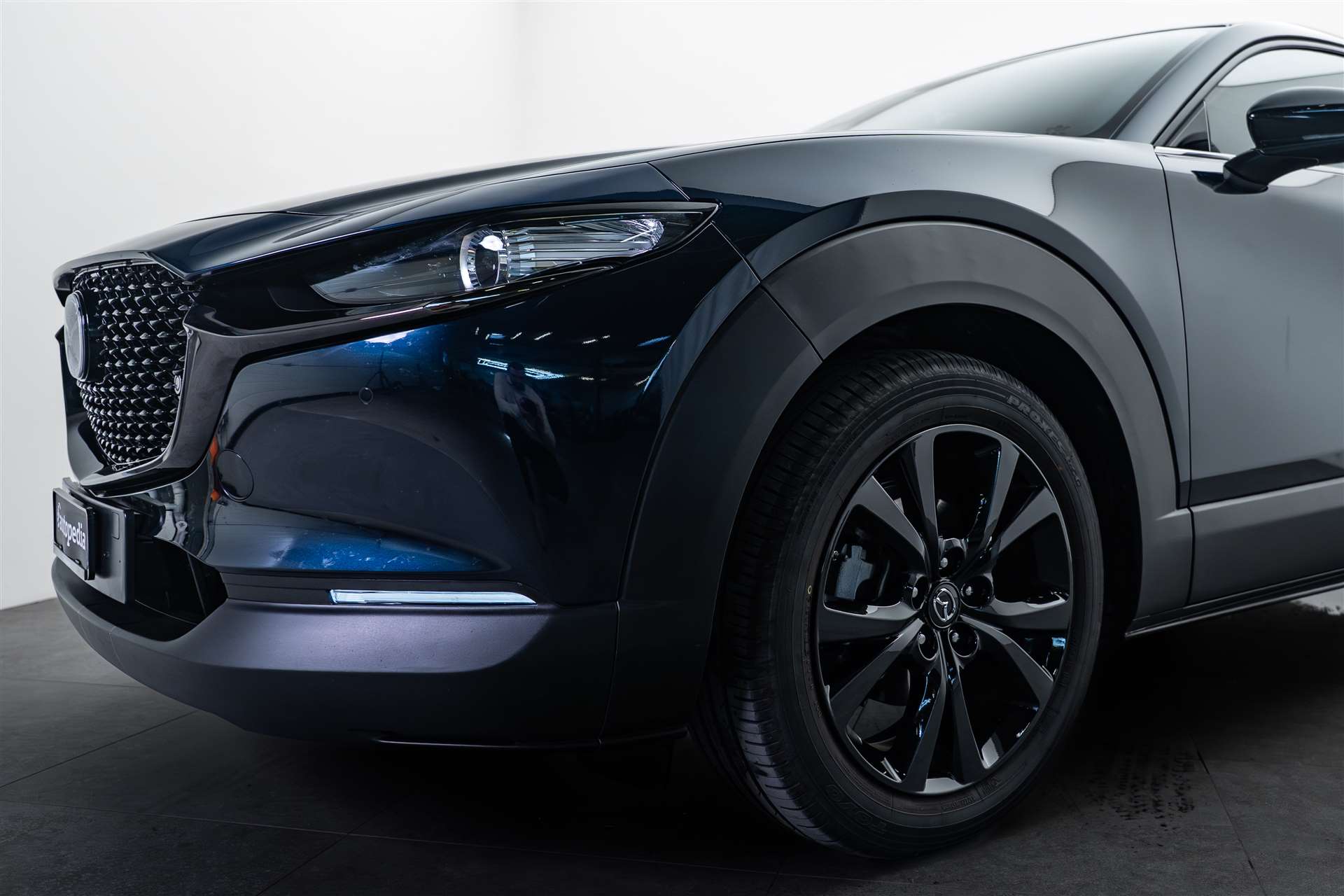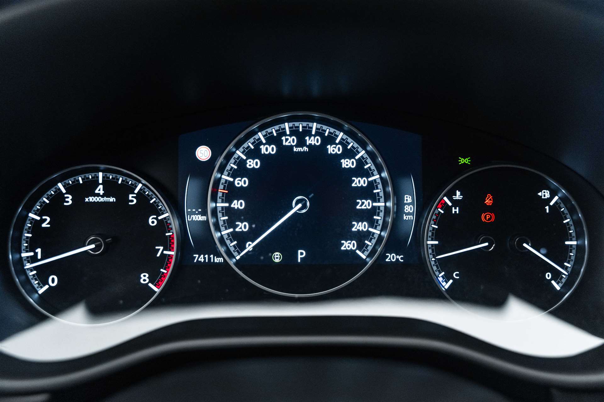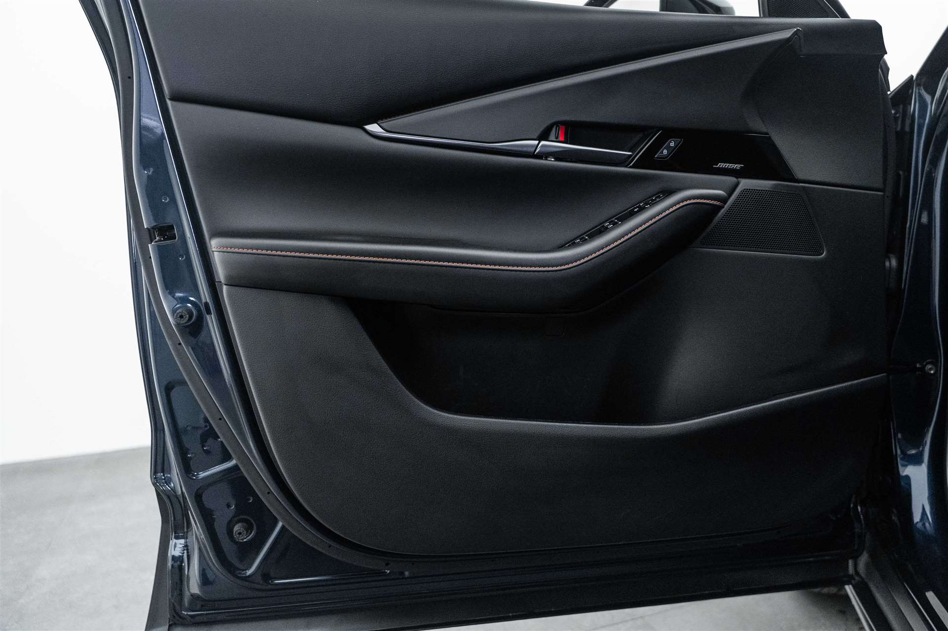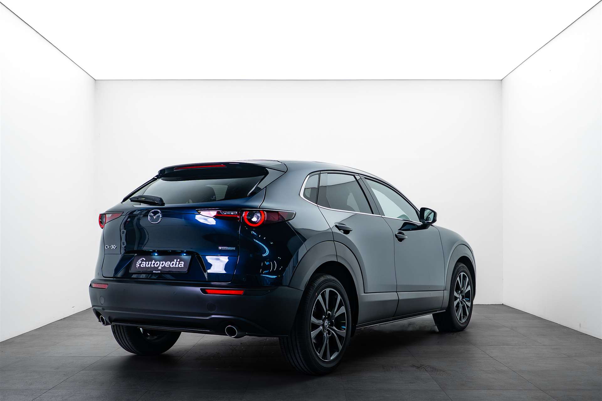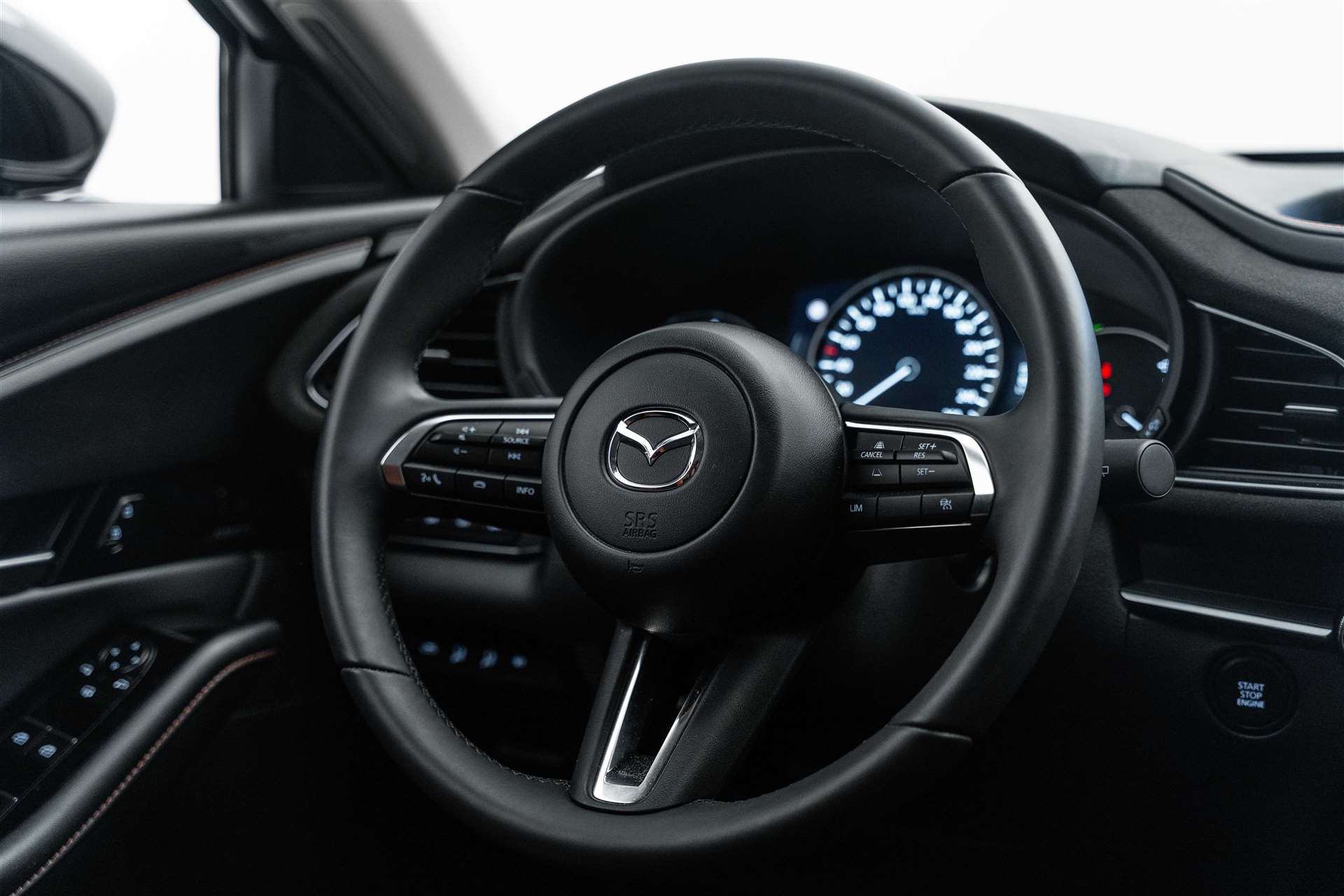 Ablagetasche (Rückseite Beifahrersitz), ABS, Airbag: Airbag Fahrer und Beifahrer, Airbag: Fahrer-Knie-Airbag, Airbag: Seitenairbags vorne, Airbag: Vorhang vorn-hinten, Alarmanlage, Assist: Adaptive Geschwindigkeitsautomatik MRCC (Mazda Radar Cruise Control), Assist: Aufmerksamkeitswarner DAA (Driver Attention Alert), Assist: City-Notbremsassistent SCBS mit Fussgänger- und Fahrraderkennung, Assist: Dynamische Stabilitätskontrolle (DSC) und Traktionskontrolle (TCS), Assist: Einparkhilfe mit Parksensoren hinten, Assist: Einparkhilfe mit Parksensoren vorne, Assist: Elektronische Parkbremse mit Auto-Hold-Funktion und Berganfahrhilfe, Assist: Intelligente Geschwindigkeitsautomatik und Geschwindigkeitsbegrenzer mit Verkehrszeichen, Assist: Pre-Crash Safety mit aktivem Bremseingriff SBS (Smart Brake Support), Assist: Rückfahr-Querverkehrswarner (RCTA, Rear Cross Traffic Alert), Assist: Rückfahrkamera, Assist: Spurhalteassistent LAS (Lane-keep Assist System) mit aktiver Lenkunterstützung, Assist: Spurwechselassistent (BSM, Blind Spot Monitoring) mit Totwinkelwarner, Assist: Verkehrszeichenerkennung (TSR, Traffic Sign Recognition), Aussenspiegel automatisch abblendend auf Fahrerseite, Aussenspiegel beheizbar und automatisch einklappbar, Aussenspiegel in Brilliant Black, Aussenspiegel rechts mit automatischer Absenkfunktion zum Rückwärtsfahren, Blenden im Seitenfensterbereich in Brilliant Black, Bordcomputer, Dachheckspoiler in Brilliant Black, Dekor: Interieur schwarz mit Ziernähten in Terracotta und Dekorelementen in Gunmetal Black, Dunkel getönte Scheiben hinten (Privacy Glass), eCall, Elektrische Fensterheber vorn und hinten mit Automatikfunktion, Elektrische Heckklappe, Fahrwerk: G-Vectoring Control Plus, die Fahrdynamikregelung von Mazda, Garantie: 6 Jahre oder 150'000 km, Getriebe: 6-Gang-Getriebe, Head-up-Display mit Projektion auf die Windschutzscheibe, i-stop, das intelligente Stopp-Start-System von Mazda, Innenspiegel automatisch abblendbar, Isofix-Kindersitzverankerungen (2x), Keyless Entry mit Smart Key, Klima: 2-Zonen-Klimaautomatik mit Ventilation hinten, Kofferraumorganisator Smart Cargo System (SCS), Kosmetikspiegel auf Beifahrerseite und Fahrerseite, beide beleuchtet, Kühlergrill in Brilliant Black, Kühlergrilleinfassung in Black Chrome, Lackierung: Uni-Lackierung, LED-Innenbeleuchtung, Lederlenkrad und -schaltknauf, Lenkrad: Lenkrad längs- und höhenverstellbar, Lenkrad: Multifunktionslenkrad, Licht: Fernlichtautomatik (HBC, High-Beam Control), Licht: LED-Rückleuchten, Licht: Lichtautomatik, Licht: Scheinwerfer mit Coming-/Leaving-Home-Funktion, Licht: Voll-LED-Scheinwerfer, Mazda M Hybrid, Mild-Hybridsystem (M-HEV) mit Bremsenergie-Rückgewinnung, Media: 12 Lautsprecher, Media: Apple CarPlay wireless und Android Auto wireless, Media: Audiosystem mit DAB+-Radio, 2x USB- C- und 12-V-Anschluss, Media: Bluetooth für Smartphones und Audiogeräte, Media: Bose Premium Surround Sound-System, Media: Instrumentenanzeige mit 7'-TFT-Multidisplay, Media: Mazda Connect mit 10,25"-TFT-Display und Sprachassistent Alexa, Media: Mazda Connected Services, Media: Multi Commander HMI auf der Mittelkonsole, Media: MyMazda App, Media: Navigationssystem, Media: Wireless-Ladestation (für Smartphones mit Qi-Standard), Mittelarmlehne vorne mit Ablagefach, Motor-Startknopf, Polster: Simililedersitze in Terracotta mit Sitzfläche in Leganu schwarz (Wildlederoptik), Räder: Leichtmetallfelgen 18" Farbe Black Metallic 215/55 R18, Räder: Reifendruckkontrollsystem, Räder: Reifenreparatur-Set (Tire Fit), Scheibenwischer mit integrierter Waschdüse, Scheibenwischer mit Regensensor, Servolenkung, Sitze: Beifahrersitz höhenverstellbar, Sitze: Fahrersitz elektrisch verstellbar (5-fach) und mit Memory-Funktion für Sitzeinstellung,, Sitze: Fahrersitz in Höhe und Sitzkissen in Neigung verstellbar, Sitze: Fahrersitz mit einstellbarer Lendenwirbelstütze, Sitze: Rücksitzlehnen getrennt abklappbar 60:40, Sitze: Vordersitze heizbar, Zentralverriegelung mit Fernbedienung