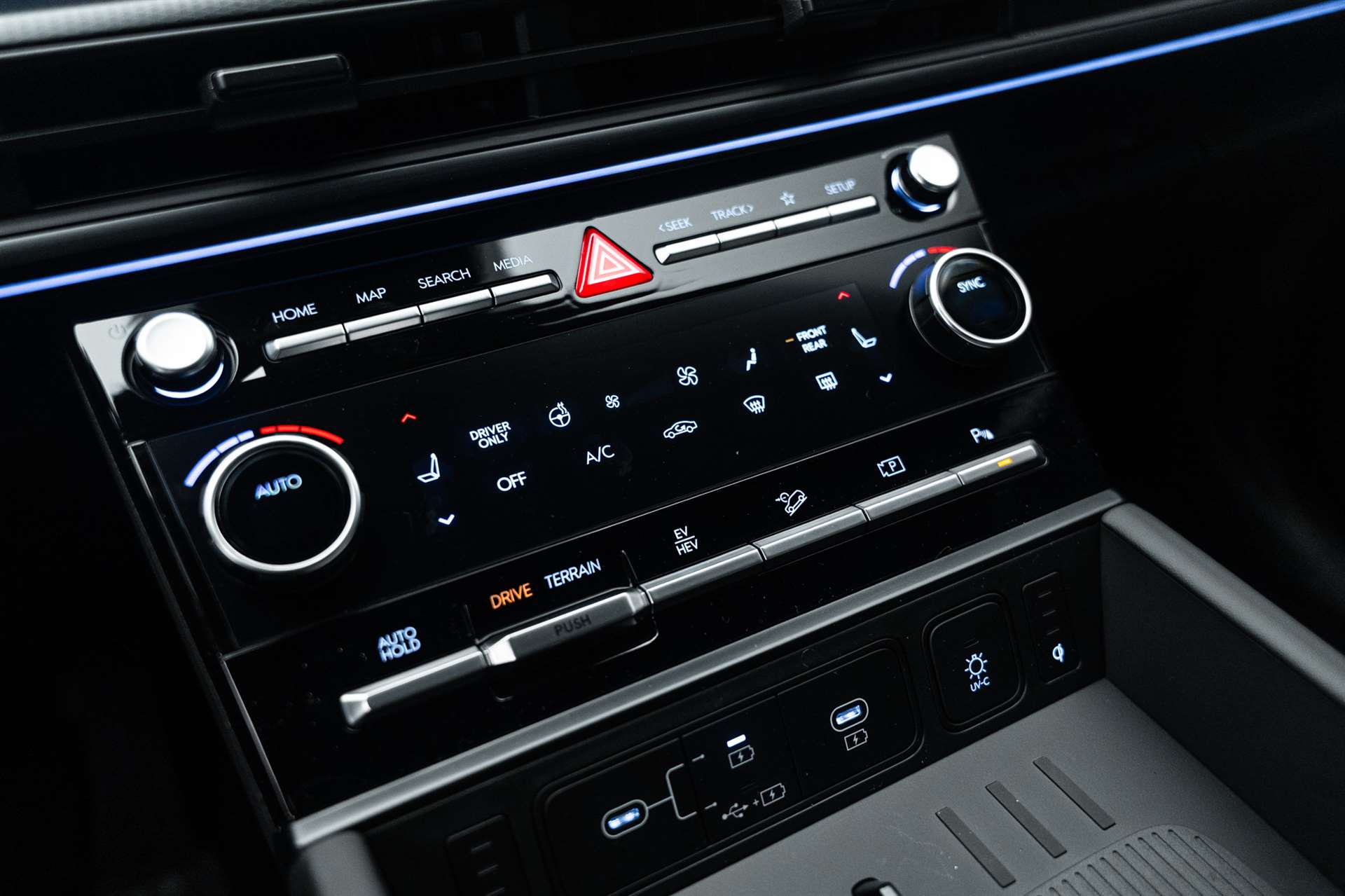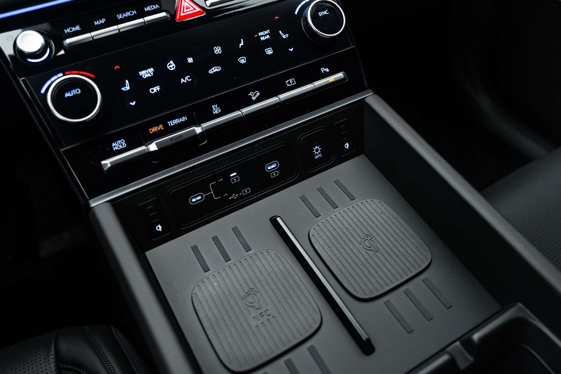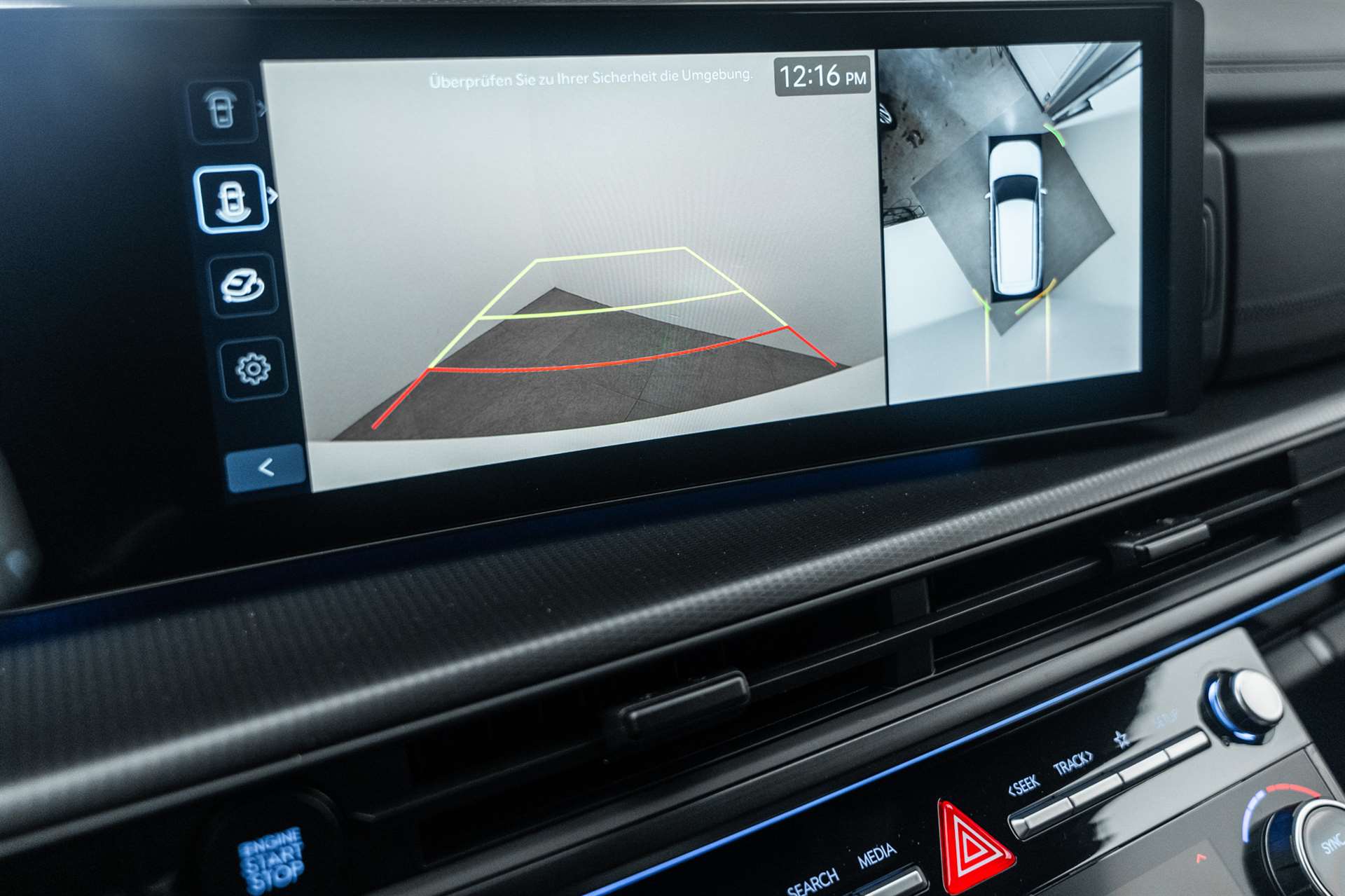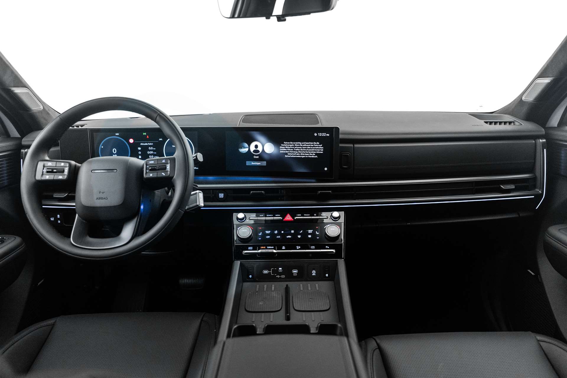 220 V Spannungswandler, ABS, EBD elektronische Bremskraftverteilung, Airbag: Airbag Beifahrer deaktivierbar, Airbag: Front- und Seitenairbags vorne, Airbag: Knieairbag Fahrerseite, Center-Airbag vorne, Airbag: Vorhangairbags vorne und hinten, Akustik-Verbundglas vorne, Alarmanlage, Ambientebeleuchtung, Anhänger Stabilisierungkontrolle TSA, Assist: 360° Rundumsichtkamera, Assist: Aktiver Totwinkelassistent mit Videoübertragung auf Kombiinstrument, Assist: Aufmerksamkeitsassistent mit Kamera (Fahrer), Assist: Autobahn- und Stauassistent, Assist: Automatische Ein- und Ausparkfunktion mit Fernbedienung, Assist: Bergabfahrhilfe (DAC), Assist: Berganfahrhilfe (Hill Holder), Assist: Einparkhilfe hinten mit Bremsassistent, Assist: Einparkhilfe vorne und hinten und seitwärts, Assist: Einparkhilfe vorne und hinten, Rückfahrkamera, Assist: Elektrische Parkbremse mit Auto-Hold-Funktion, Assist: Elektronische Traktionskontrolle, Assist: Insassenalarm mit Ultraschall-Sensoren (Rear Occupant Assist), Assist: Navigationsbasierter adaptiver Tempomat, Assist: Notbremsassistent mit Abbiege- und Kreuzungsfunktion, Assist: Notbremsassistent mit Fussgänger-/Fahrraderkennung und Abbiegefunktion, Assist: Querverkehrswarner hinten mit Bremsassistent, Assist: Spurfolgeassistent, Assist: Spurhalteassistent, Assist: Spurwechselassistent, Assist: Tempomat mit Distanzassistent - autom. Verzögerung bis zum Stillstand, Assist: Verkehrszeichenerkennung mit automatischer Geschwindigkeitsregelung, Aussenspiegel elektrisch einklappbar, Aussenspiegel mit Welcome-Light, Automatische Niveauregulierung hinten, Automatisches Notrufsystem eCall, Bordcomputer, Dachreling, Design-Kühlergrill mit Applikationen in dunklem Chrom, Digital Key 2.0, Digitaler Innenspiegel mit Smart-View-Technologie (DCM), Dreipunkt-Sicherheitsgurte auf allen Plätzen, vorne höhenverstellbar, Elektrisch verstell- und heizbare Aussenspiegel mit integrierten Seitenblinkern, Elektrische Fensterheber hinten mit Schnellsenkfunktion und Einklemmschutz, Elektrische Fensterheber vorne mit Schnellsenkfunktion und Einklemmschutz, Elektrische Heckklappe mit hands-free Funktion, Elektronisches Stabilitätsprogramm ESP mit Multikollisionsbremse, Fahrwerk: HTRAC Allradantrieb mit 3 verschiedenen Fahrmodi und variabler Drehmomentsteuerung, Fahrwerk: Terrain Mode Selector, Garantie: 5 Jahre ohne Kilometerbegrenzung, Garantie: Garantie 12 Jahre gegen Durchrostung, Garantie: Hochvoltbatterie: 8 Jahre / 160 000 km, Gepäcknetz(e), Gepäckraumrollo, Getriebe: 6-Gang Automatikgetriebe, Getriebe: Elektronische Gangschaltung HEV (Shift by wire), Head-up Display mit Projektion auf die Windschutzscheibe, Hyundai Logo und Modellschriftzug in schwarz, Integrierter Haltegriff C-Säule, ISOFIX-Kindersitzverankerung 2. Sitzreihe, Klima: 2-Zonen-Klimaautomatik mit Anti-Beschlagsystem, Klima: Separate Klimaregulierung in der 3. Sitzreihe, Lackierung: Uni-Lackierung, Lenkrad; Lederlenkrad und -schaltknauf, Lenkrad: Lederlenkrad zweifarbig, Lenkrad: Lenkrad beheizbar, Lenkrad: Lenkrad vertikal und axial verstellbar, Lenkrad: Schaltpaddles am Lenkrad, Licht: Bi-LED Scheinwerfer, Licht: Fernlichtassistent, Licht: LED Rücklichter, Licht: LED-Projektionsscheinwerfer, Licht: LED-Tagfahrlicht, Licht: Lichtautomatik, Licht: Scheinwerfer mit Welcome- und Escort-Funktion, Media: Audio-Fernbedienung am Lenkrad, Media: Digitale Armaturentafel mit 12.3'' TFT LCD Anzeige, Media: Kabellose Android Auto - und Apple CarPlay-Funktion, Media: Kabelloses Laden für Smartphone, Media: Mapcare Lifetime, Media: Multi-Bluetooth mit Freisprecheinrichtung, Media: Navigationssystem mit 12.3"-Farbdisplay, Media: Premium Audiosystem Bose mit Verstärker, Subwoofer und Center-Speaker, Media: Telematikdienst Bluelink Lite und LIVE Services (10 Jahre gratis), Passagier-Kommunikationssystem 3. Sitzreihe, Polster: Innenausstattung Nappa-Leder, Polster: Innenverkleidung Wildleder (Dachhimmel, Säulen, Sonnenblenden), Privacy Glass, abgedunkeltes Scheibenglas hinten (ab B-Säule), Räder: 20'' Leichtmetallfelgen, Räder: Reifendruckkontrollsystem, Räder: Reifenreparatur-Set, Radläufe und Leiste oberhalb des Schwellers in schwarz glänzend, Regensensor, Schlüsselloses Zugangssystem Smart Key mit Engine Start/Stop-Taste, Servolenkung, Sitze: 2. Sitzreihe gentrennt abklappbar (60/40) und verschiebbar (60/40), Sitze: Elektrisch einstellbare Lendenwirbelstütze, Fahrersitz, Sitze: Elektrisch verstellbarer Fahrer- und Beifahrersitz, Sitze: Fahrersitz mit Memoryfunktion, Sitze: One touch System zum Einstieg in die dritte Sitzreihe, Sitze: Sitzbelüftung vorne, Sitze: Sitzheizung 2. Sitzreihe aussen, Sitze: Sitzheizung vorne, Sitze: Vordersitze mit Relaxfunktion, Sonnenschutzrollo für Fenster 2. Sitzreihe, Start-/Stopp-Automatik, Türgriffe in Wagenfarbe, UV-C Desinfektionssschale, Wegfahrsperre elektronisch, Zentralverriegelung mit Fernbedienung