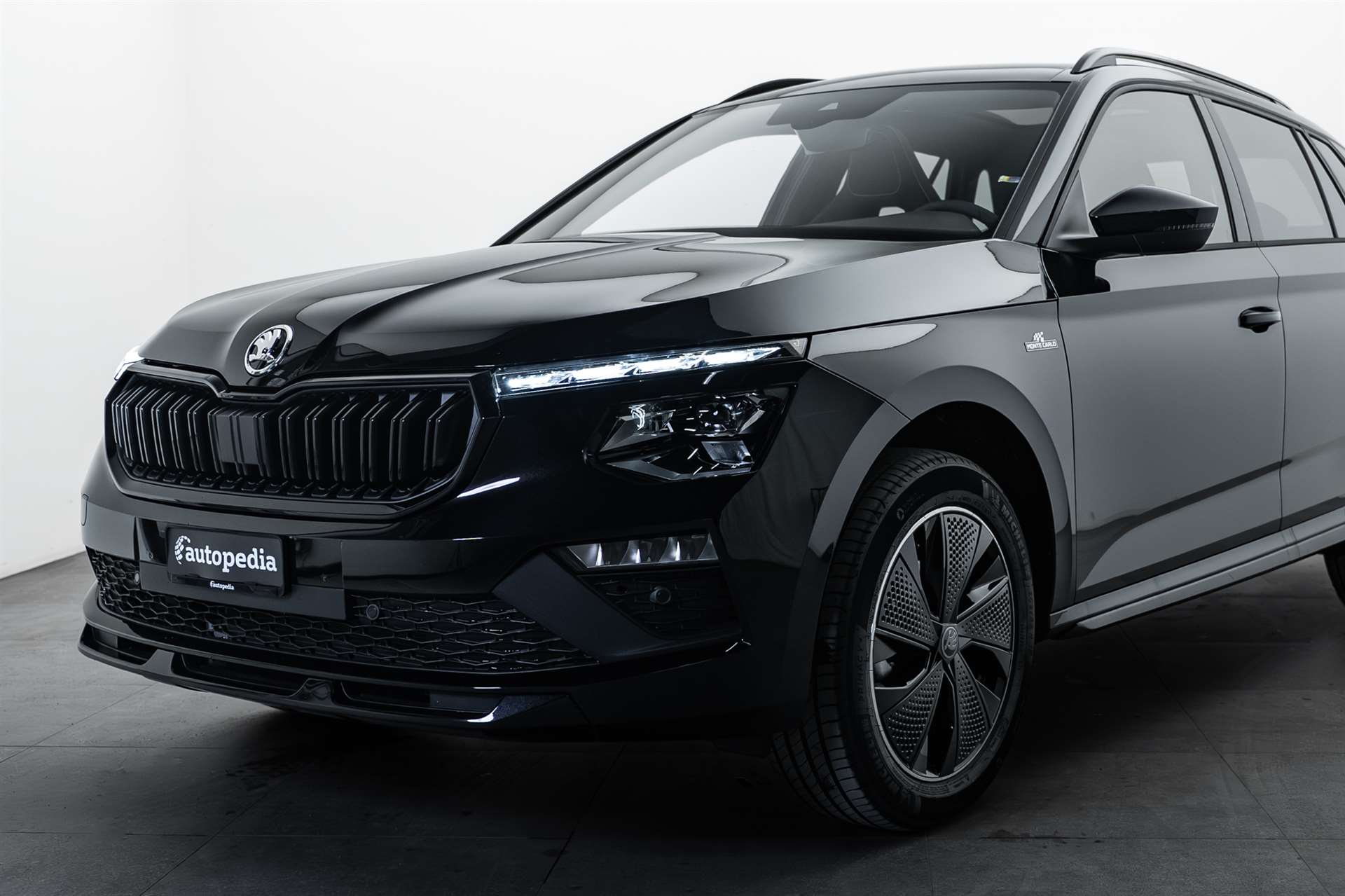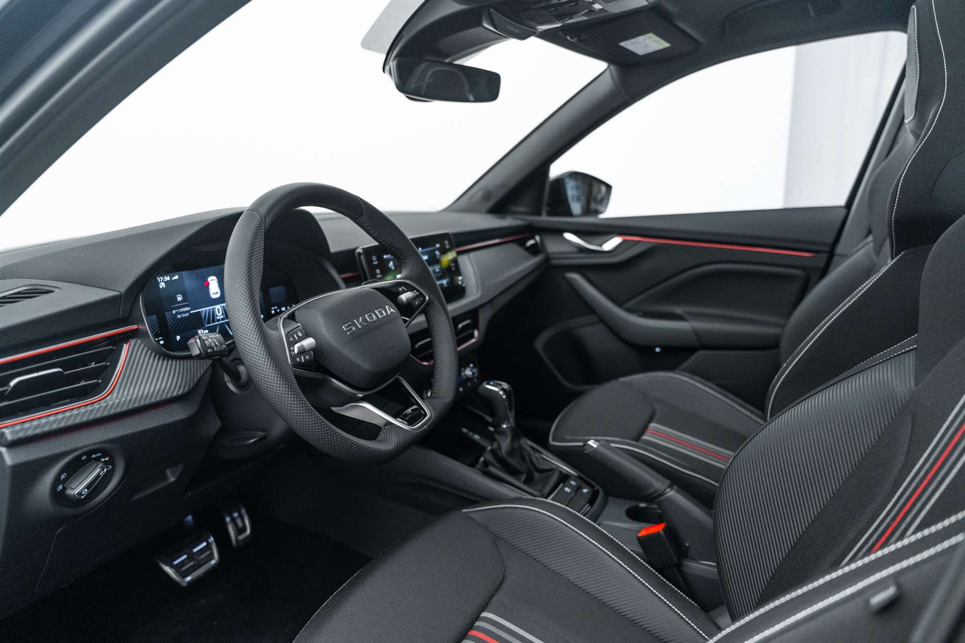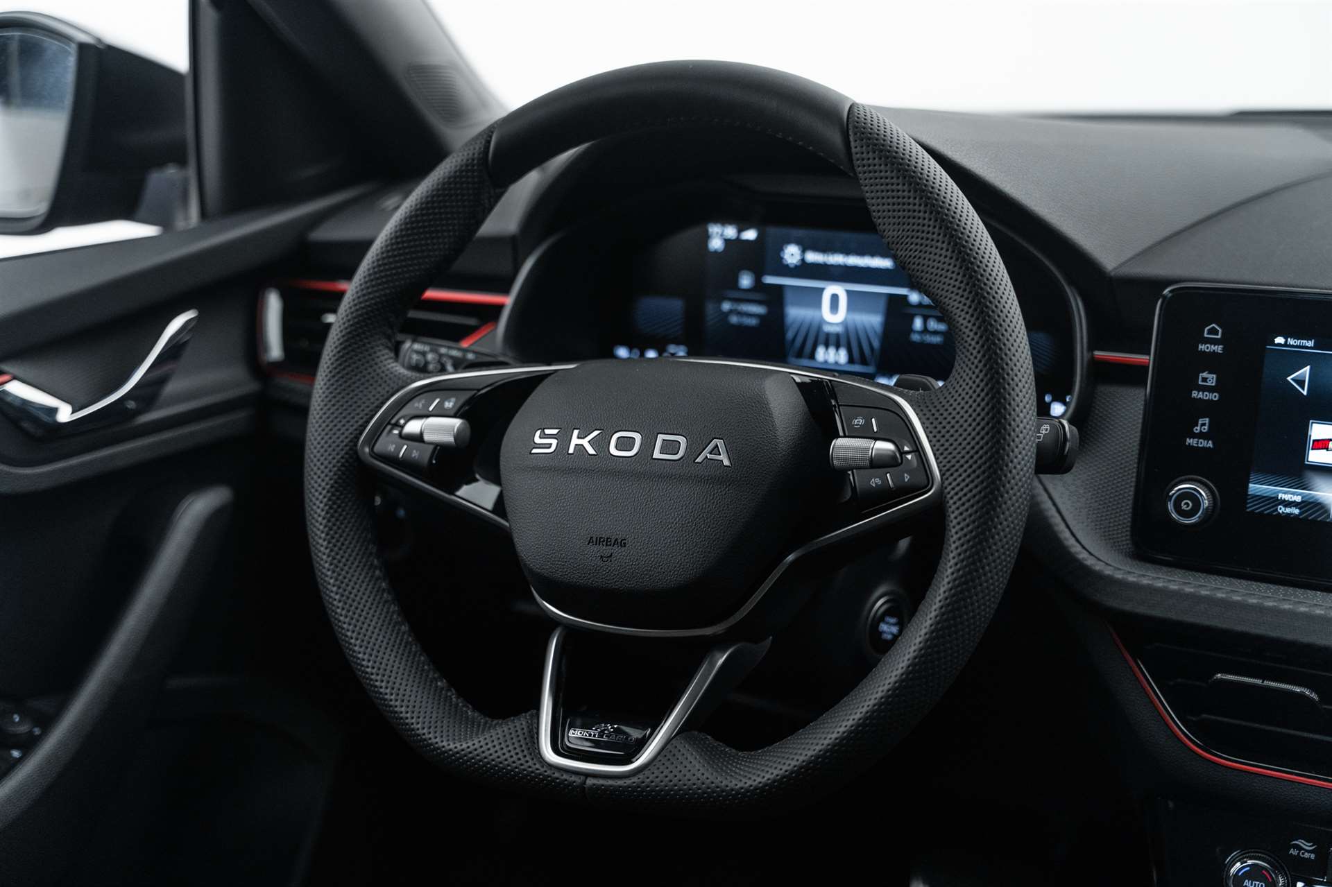 3-Punkt-Sicherheitsgurte auf allen Plätzen, ABS mit ASR und EDS, Airbag: Airbag Beifahrer deaktivierbar, Airbag: Airbag Fahrer und Beifahrer, Airbag: Kopf- und Seitenairbags vorne, Airbag: Kopf- und Seitenairbags vorne, Ambiente Beleuchtung 2-farbig, Assist: Ablenkungs- und Müdigkeitserkennung, Assist: Berganfahrassistent, Assist: Front Assistant inkl. City-Notbremsfunktion, Assist: Geschwindigkeitsregelanlage (Tempomat), Assist: Parksensoren hinten, Assist: Regensensor mit Lichtassistent (Coming Home, Leaving Home, Tunnel Light), Assist: Spurhalteassistent "Lane Assist", Assist: Verkehrszeichenerkennung, Aussenspiegel elektrisch einstell-, beheiz- und anklappbar, automatische Abblendung Fahrerseite, Aussenspiegel in schwarz lackiert, Aussenspiegel rechts und links beheizbar und elektrisch verstellbar, Chromrahmen am Kühlergrill, Dachhimmel schwarz, Dachreling schwarz-lackiert, Design Monte Carlo, Drehzahlmesser, Drittes Bremslicht LED, EASY START, Elektrische Fensterheber vorne + hinten, Elektronisches Stabilitäts-Programm (ESP), Emergency Call (Notruf), ESC (Elektronische Stabilisierungskontrolle) mit Multikollisionsbremse, ABS und ASR, Fahrprofilauswahl "Driving Mode Selection", Fahrprofilauswahl "Driving Mode Selection", Getriebe: 7-Gang DSG, Gurtanlegesignalisation für alle Passagiere, Heckscheiben-Wisch-/Waschanlage, Heckscheibenheizung, Innenspiegel automatisch abblendbar, Klappbare Gepäckhaken im Kofferraum, Klima: Klimaanlage "Climatronic", 2-Zonen-Temperaturregelung, vollautomatisch, getrennt regelbar, Kühlergrill schwarz lackiert, Lackierung: Uni-Lackierung, Lenkrad: 3-Speichen-Sport-Leder-Multifunktionslenkrad mit Schaltwippen (DSG), Lenkrad: 3-Speichen-Sport-Leder-Multifunktionslenkrad mit Schaltwippen (DSG), beheizbar und HOD, Lenkrad: 3-Speichen-Sport-Leder-Multifunktionslenkrad mit Schaltwippen (DSG), beheizbar und HOD, Licht: Easy Light Assist (automatische Lichtschaltung, Coming Home, Leaving Home), Licht: LED Rückleuchten mit dynamischer Blinkleuchte, Licht: LED-Tagfahrlicht, Licht: Nebelscheinwerfer mit Cornering-Funktion, Licht: Voll-LED-Matrix-Scheinwerfer und AFS (Adaptive Frontlight System), Media: 2 USB-C Anschlüsse im Fond, Media: 2 USB-C Anschlüsse vorne, Media: 4 zusätzliche Lausprecher hinten, Media: 4 zusätzliche Lausprecher hinten, Media: DAB - Digitaler Radioempfang, Media: Infotainment Online 3 Jahre + "Care Connect" (Remote Access 3 Jahre), Media: Skoda Infotainment 8.25", Media: SmartLink (CarPlay und Android Auto), Media: SmartLink (CarPlay und Android Auto), Media: Telefonvorbereitung mit Bluetooth, Mittelarmlehne hinten mit Doppel Getränkehalter und ohne Durchladefunktion, Mittelarmlehne hinten mit Doppel Getränkehalter und ohne Durchladefunktion, Mittelarmlehne vorne inkl. grosser Jumbo-Box, Paket: Black Paket, Paket: Light and View Plus Paket, Paket: Open Sky Paket, Paket: Winter Paket, Panoramadach, Polster: Sportsitzbezüge Stoff schwarz, teilweise Carbon-Optik und roten und grauen Streifen, Räder: Leichtmetallräder 17" "Kajam Aero" schwarz mit schwarzer Aero-Blende, Räder: Pannenset (Kompressor und Flasche mit Dichtmittel, ohne Reserverad), Räder: Reifendruckkontrollsystem, Seitliche Luftführungen im Stossfänger vorne schwarz lackiert, Servolenkung, Sitze: 3 Kopfstützen hinten, Sitze: ISOFIX-Vorbereitung und Top-Tether, Sitze: Rücksitzlehne geteilt umklappbar (60:40), Sitze: Vordersitze heizbar, Sitze: Vordersitze höhenverstellbar, SKODA Garantie: Anschlussgarantie 1 Jahr, max. 100000 km, SKODA Neuwagen-Garantie: 2 Jahre ohne Kilometerbegrenzung, SunSet (Heckscheibe und hintere Seitenscheiben dunkel getönt), SunSet (Heckscheibe und hintere Seitenscheiben dunkel getönt), Textilfussmatten vorne und hinten, Türgriffe aussen in Wagenfarbe, Virtuelles Cockpit Basic, Waschwasser-Standanzeige, Wegfahrsperre elektronisch