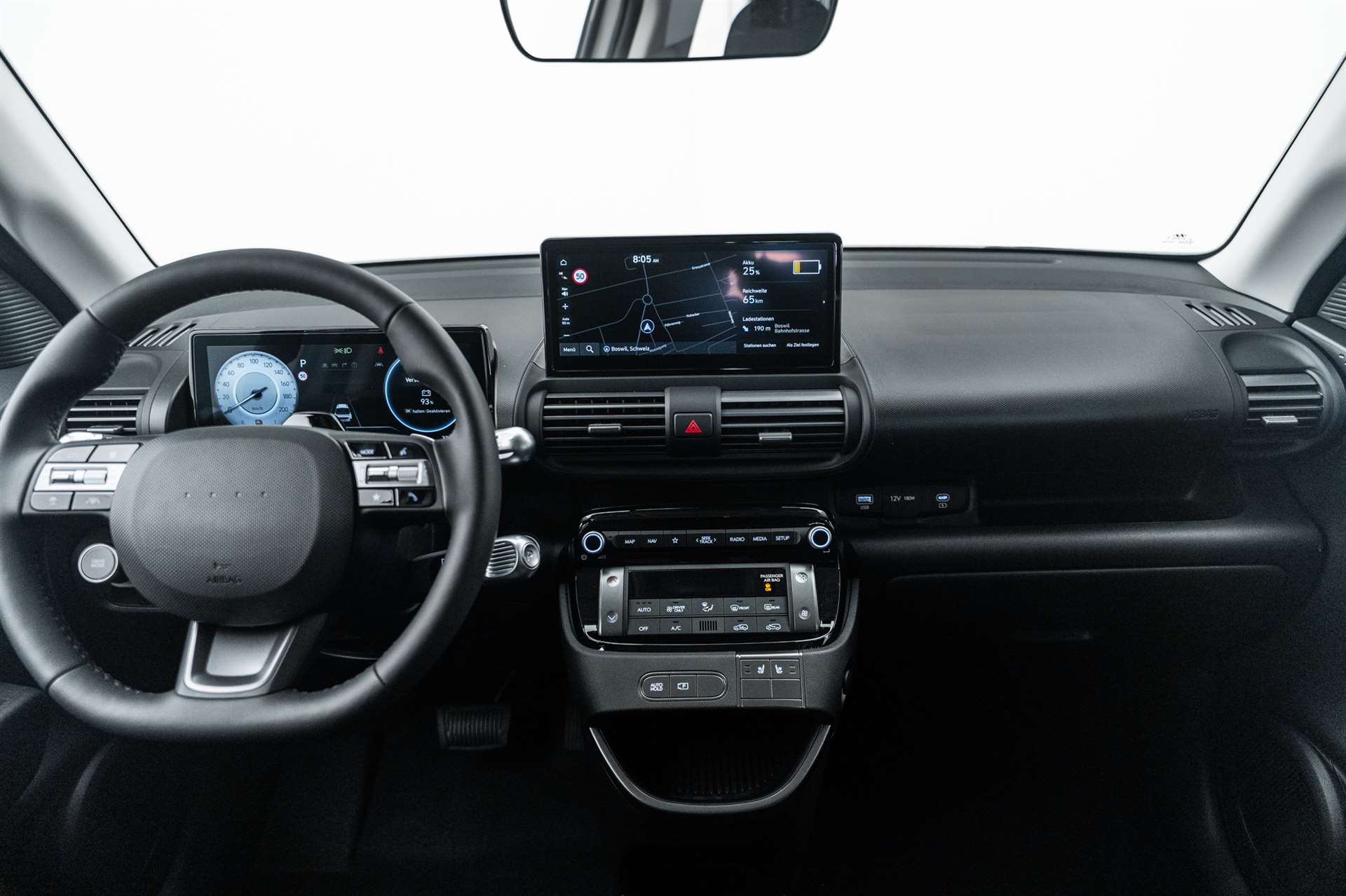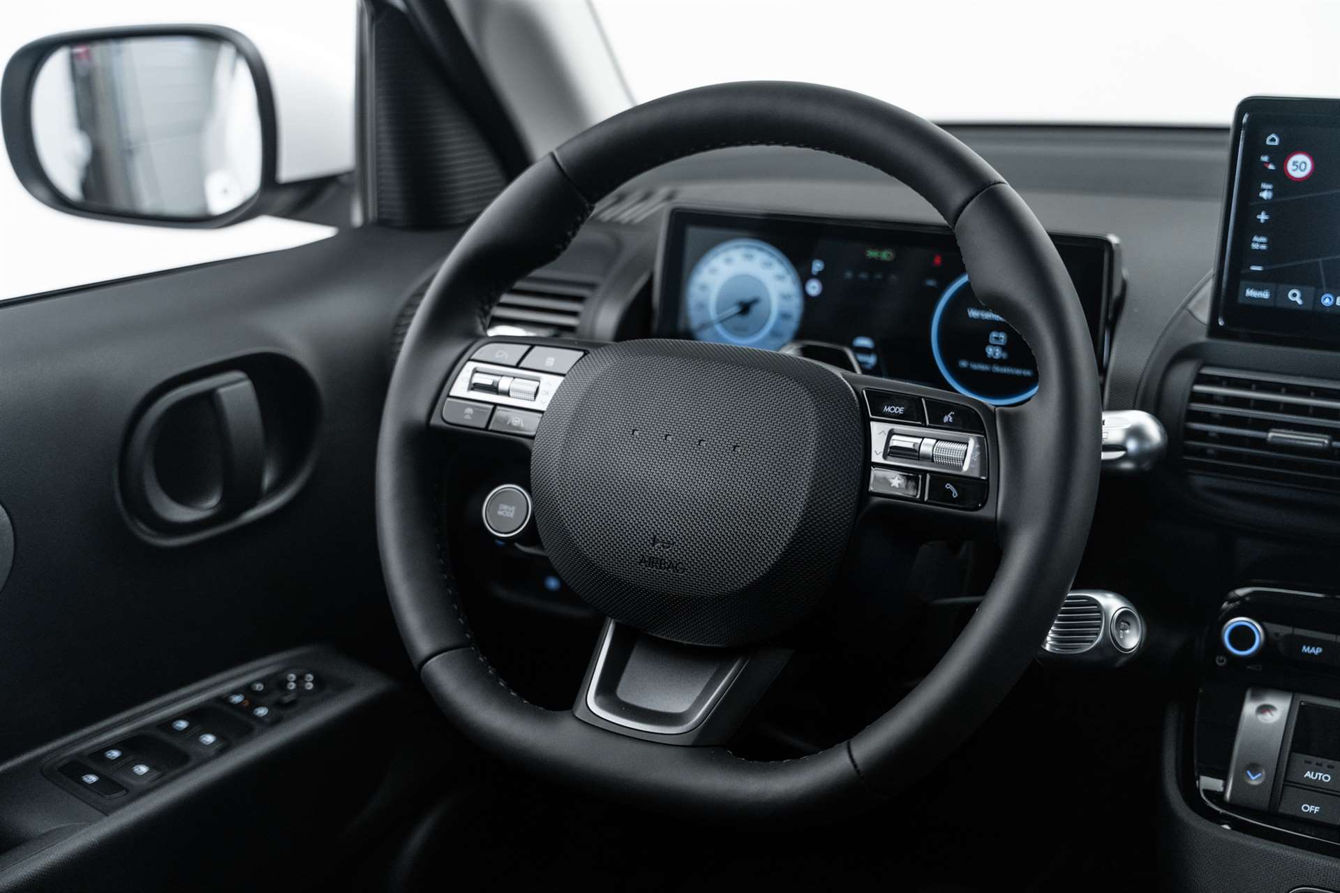 A-Säule in Wagenfarbe, Ablagefläche Fahrer- und Beifahrersitz (Rückseite), ABS mit elektronischer Bremskraftverteilung EBD, Airbag: Center Airbag vorne, Airbag: Deaktivierung Frontairbag Beifahrerseite, Airbag: Front- und Seitenairbags vorne, Vorhangairbags vorne und hinten, Assist: Anfahralarm Vorderfahrzeug, Assist: Aufmerksamkeitsassistent, Assist: Autobahn- und Stauassistent, Assist: Automatisches Notrufsystem eCall, Assist: Einparkhilfe hinten, Assist: Elektrische Parkbremse mit Auto-Hold-Funktion, Assist: Elektronische Traktionskontrolle, Assist: Notbremsassistent mit Abbiege-, Spurwechsel- und Ausweichfunktion, Assist: Notbremsassistent mit Fussgänger-/Fahrraderkennung und Abbiegefunktion, Assist: Rückfahrkamera, Assist: Spurhalteassistent, Assist: Tempomat mit Geschwindigkeitsbegrenzer, Drive Mode Select, Elektrisch einklappbare Aussenspiegel, Elektrisch verstell- und beheizbare Aussenspiegel, Elektronisches Stabilitätsprogramm ESP mit Multikollisionsbremse, Fensterheber vorne und hinten elektrisch, Garantie: 5 Jahre ohne Kilometerbegrenzung, Garantie: Garantie 12 Jahre gegen Durchrostung, Garantie: Hochvoltbatterie: 8 Jahre / 160 000 km, Gepäckraumbeleuchtung, Getriebe: Direktantrieb, kein Getriebe, Insassenalarm, ISOFIX-Kindersitzverankerung hinten, Klima: Klimaautomatik, Lackierung: Uni-Lackierung, Ladegerät (On-Board Charger) dreiphasig bis zu 11 kW, Ladekabel 5 Meter Mode 3 Typ 2, 3-Phasig, inkl. Hyundai-Tragtasche, Lenkrad: Audiofernbedienung am Lenkrad, Lenkrad: Lederlenkrad, Lenkrad: Lenkrad beheizbar, Lenkrad: Schaltwippen am Lenkrad mit i-Pedal Funktion, Licht: Fernlichtassistent, Licht: Halogen-Projektionsscheinwerfer, Licht: Halogen-Rückleuchten, Licht: LED Blinker, Licht: LED-Tagfahrlicht, Licht: Lichtautomatik, Make-up Spiegel Fahrer, Manuelle Heckklappe, Media: 4 Lautsprecher, Media: Android Auto - und Apple CarPlay -Funktion, Media: Digitale Armaturentafel mit 10.25'' TFT LCD Anzeige, Media: Digitalradio DAB+, Media: MapCare Lifetime / Over-the-Air Update, Media: Multi-Bluetooth mit Freisprecheinrichtung mit Spracherkennung, Media: Navigationssystem mit 10.25" Touchscreen, Media: Telematikdienst Bluelink Lite (10 Jahre gratis), Media: USB- Anschlüsse vorne, Polster: Stoffsitze, Räder: Reifendruckkontrollsystem, Räder: Reifenreparatur-Set, Räder: Stahlfelgen 15" mit Radzierblenden, Radlaufverkleidung in Schwarz, Servolenkung, Shift by wire, Sitze: Flach umklappbarer Fahrer- und Beifahrersitz, Sitze: Manuell höhenverstellbarer Fahrersitz, Sitze: Rücksitze getrennt abklappbar (50/50), Sitze: Sitzheizung vorne, Smart Key mit Engine Start/Stop-Taste und Bewegungssensor, Türgriffe und Aussenspiegel in Wagenfarbe, Unterfahrschutz silber, Vorbereitung für Anhängevorrichtung, Wärmedämmende Scheiben vorne, Zentralverriegelung