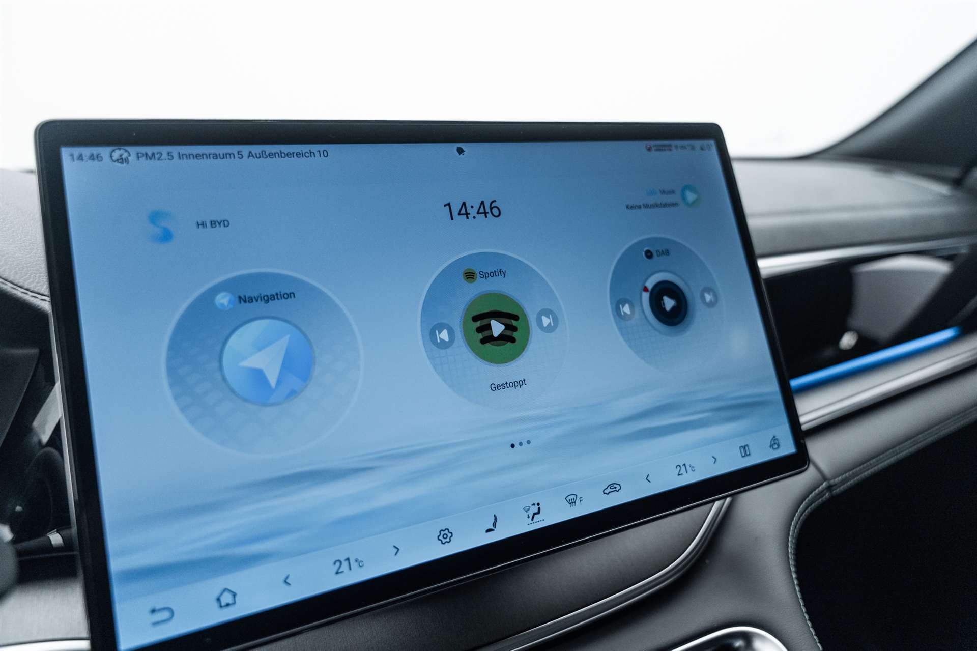 11kW On-Board Charger (OBC), 12-V-Stromanschluss, 2 x Smart Key, 4 x One-Touch-Fensterheber mit Einklemmschutzfunktion, Airbag: Fahrerairbag und Beifahrerairbag, Airbag: Frontairbag in der Mitte, Airbag: Seitenairbags vorn, Airbag: Vorhangairbags, Ambientebeleuchtung, mehrfarbig, Antiblockiersystem (ABS), Armlehne hinten, 2 Getränkehalter, Assist: 360° view camera, Assist: Adaptive Geschwindigkeitsregelung (ACC) & Intelligente Geschwindigkeitsregelung (ICC), Assist: Auto Hold, Assist: Automatische Notbremsung (AEB), Assist: Bergabfahrhilfe (HDC), Assist: Berganfahrassistent (HSA), Assist: Comfort Stop (CST), Assist: Elektrische Parkbremse (EPB), Assist: Heckkollisionswarnung (RCW), Assist: Hydraulischer Bremsassistent (HBA), Assist: Kindererkennung (CPD), Assist: Kontrollierte Verzögerung mit Feststellbremse (CDP), Assist: Müdigkeitserkennung für den Fahrer (DFW) und Aufmerksamkeitswarnung für den Fahrer (DFW), Assist: Parksensoren vorne und hinten, Assist: Querverkehrswarnung hinten (RCTA) & Querverkehrsbremse hinten (RCTB), Assist: Querverkehrswarnung vorn (FCTA) & Querverkehrsbremse vorn (FCTB), Assist: Spurhalteassistent (ELKA), Assist: Spurverlassensverhinderung (LDP), Assist: Spurverlassenswarnung (LDW), Assist: Spurwechselassistent (LCA), Assist: Toter-Winkel-Warnung (BSD), Assist: Traktionskontrolle (TCS), Assist: Überschlagskontrollsystem (RMI), Assist: Verkehrszeichenerkennung (TSR), Assist: Vorwärtskollisionswarnung (FCW), Aussenspiegel elektrisch verstellbar, elektrisch anklappbar, beheizbar, Automatisch abblendender Rückspiegel, Automatisches Verriegelungssystem, Bodenbeleuchtung vorne, Bremsüberbrückungssystem (BOS), Dachreling in Aluminium, Diebstahlsicherung, Dynamische Blinker, Elektrische Heckklappe, Elektronische Bremskraftverteilung (EBD), Elektronische Kindersicherung, ESP (Elektronisches Stabilitätsprogramm), Fahrmodus: Eco, Normal, Sport, Snow, Fahrwerk: Fahrdynamikregelung (VDC), Frontscheibe, Scheibenwischer mit Regensensor, Frontscheibe, UV-Schutz, Wärmedämmung, Schalldämmung, Fussraumbeleuchtung in den Aussenspiegeln, Garantie: Batterie-Garantie 8 Jahre oder 200'000 km, Garantie: Garantie 6 Jahre oder 150'000 km, Gepäckraumleuchte, Getriebe: Direktantrieb, kein Getriebe, Head-up-Display (HUD), ISOFIX und i-Size, Beifahrer- und äussere Rücksitze, Keyless entry & keyless start, Kindersicherung manuell, Klima: Belüftungsdüsen hinten, Kofferraum-Gepäckablage, Kraftbegrenzender Sicherheitsgurt auf dem mittleren Rücksitz, Lackierung: Metallic-Lackierung, LED-Leseleuchten hinten, LED-Leseleuchten vorn, Licht: Fernlichtassistent (HMA), Licht: Follow-me-Home, Licht: LED-Rückleuchten, Licht: LED-Scheinwerfer, automatisches Ein-/Ausschalten, Licht: LED-Tagfahrlicht, Licht: Nebelschlussleuchten, Media: 12,3" TFT-LCD-Instrumententafel, Media: 15,6" elektrisch drehbarer Touchscreen, Media: Android Auto & Apple CarPlay, Media: DAB+ & FM, Media: Infinity-Soundsystem, 10 Lautsprecher, Media: Integrierte 4G-Konnektivität2, Media: Intelligente Sprachsteuerung "Hallo, BYD", Media: Smartphone wireless charging, 2x 15 W, Media: USB-Anschlüsse hinten: 1 x 18W Typ C, 1 x 60 W Typ C, Media: USB-Anschlüsse vorn: 1 x 18W Typ C, 1 x 60 W Typ C, Mehrfarbige LED-Ladeanzeige, Mittelarmlehne hinten, 2 Getränkehalter, Mittelarmlehne vorn, 2 Getränkehalter, Notruf, Panoramadach, elektrisch verstellbares Sonnenschutzrollo, PM2.5 filter, PM2.5-Luftreinigungssystem, Privacy glass in fond, Räder: 19" Bicolor- Leichtmetallfelgen, Reifendruckkontrolle (TPMS), Servolenkung, Sitze: Beifahrersitz belüftet, beheizt, Sitze: Beifahrersitz, elektrisch verstellbar, 4-fach, Sitze: Fahrersitz belüftet, beheizt, gespeicherte Einstellung, Sitze: Fahrersitz und Beifahrer, integrierte Kopfstütze, Sitze: Fahrersitz, elektrisch verstellbar, 8-fach, Positionsspeicher, Sitze: Rücksitze 40:60 geteilt umklappbar, Sitze: Rücksitze, manuell einstellbare Kopfstütze, Türöffnungswarnung (DOW), Vier LED-Türleuchten, Vordersitz-Sonnenblenden mit beleuchtetem Schminkspiegel, Vorgespannte und kraftbegrenzende Sicherheitsgurte vorn, Wärmepumpe