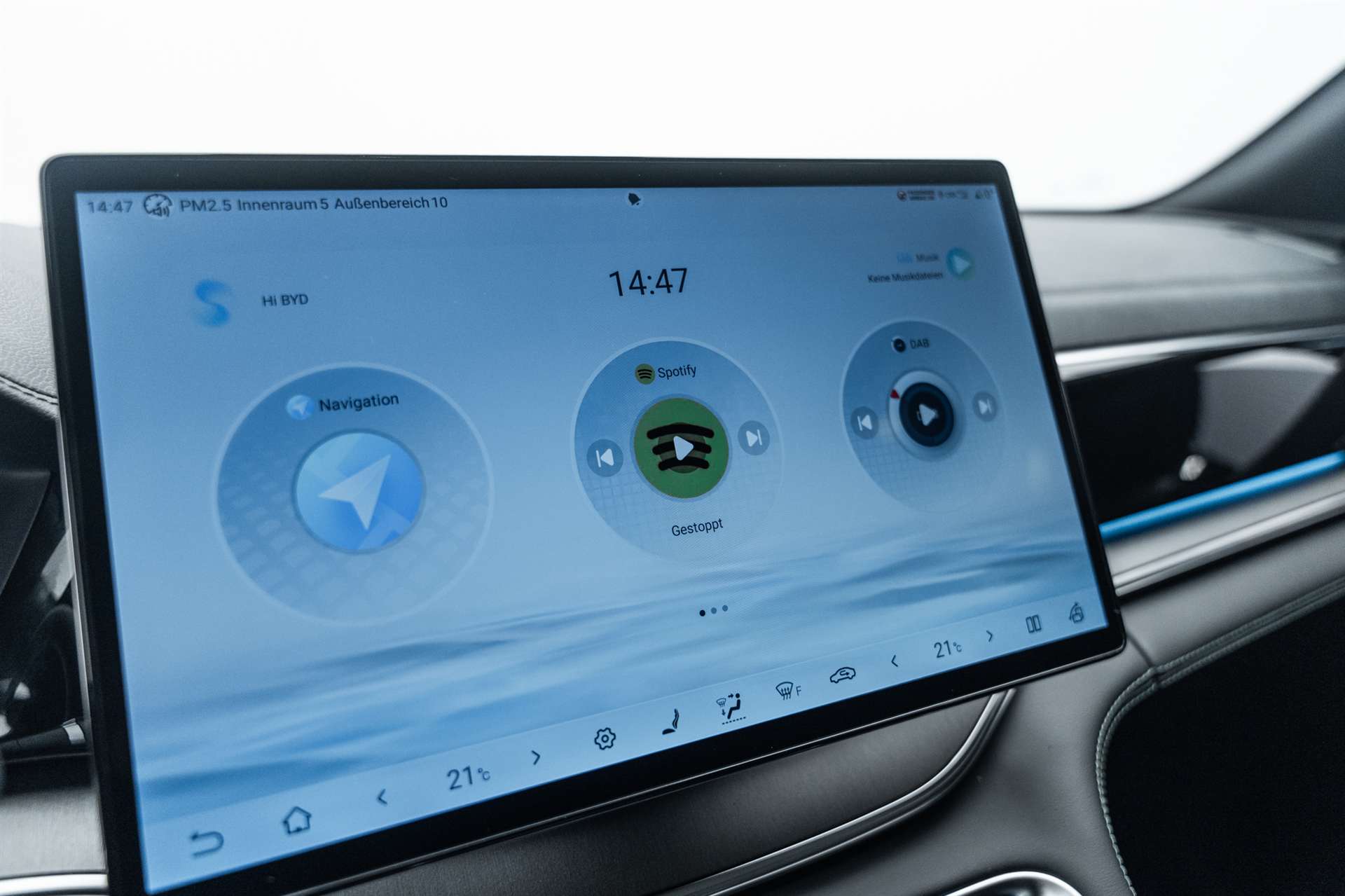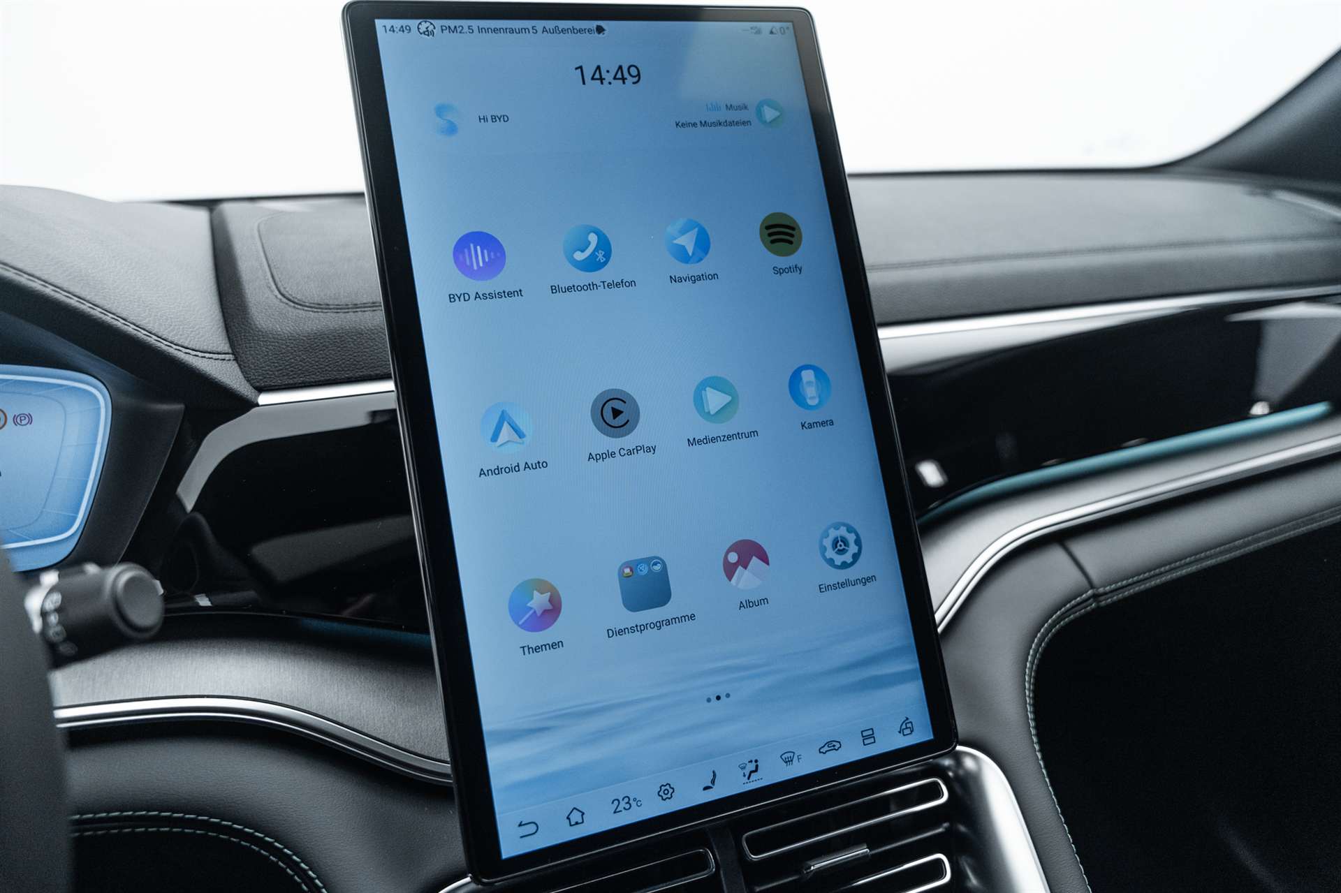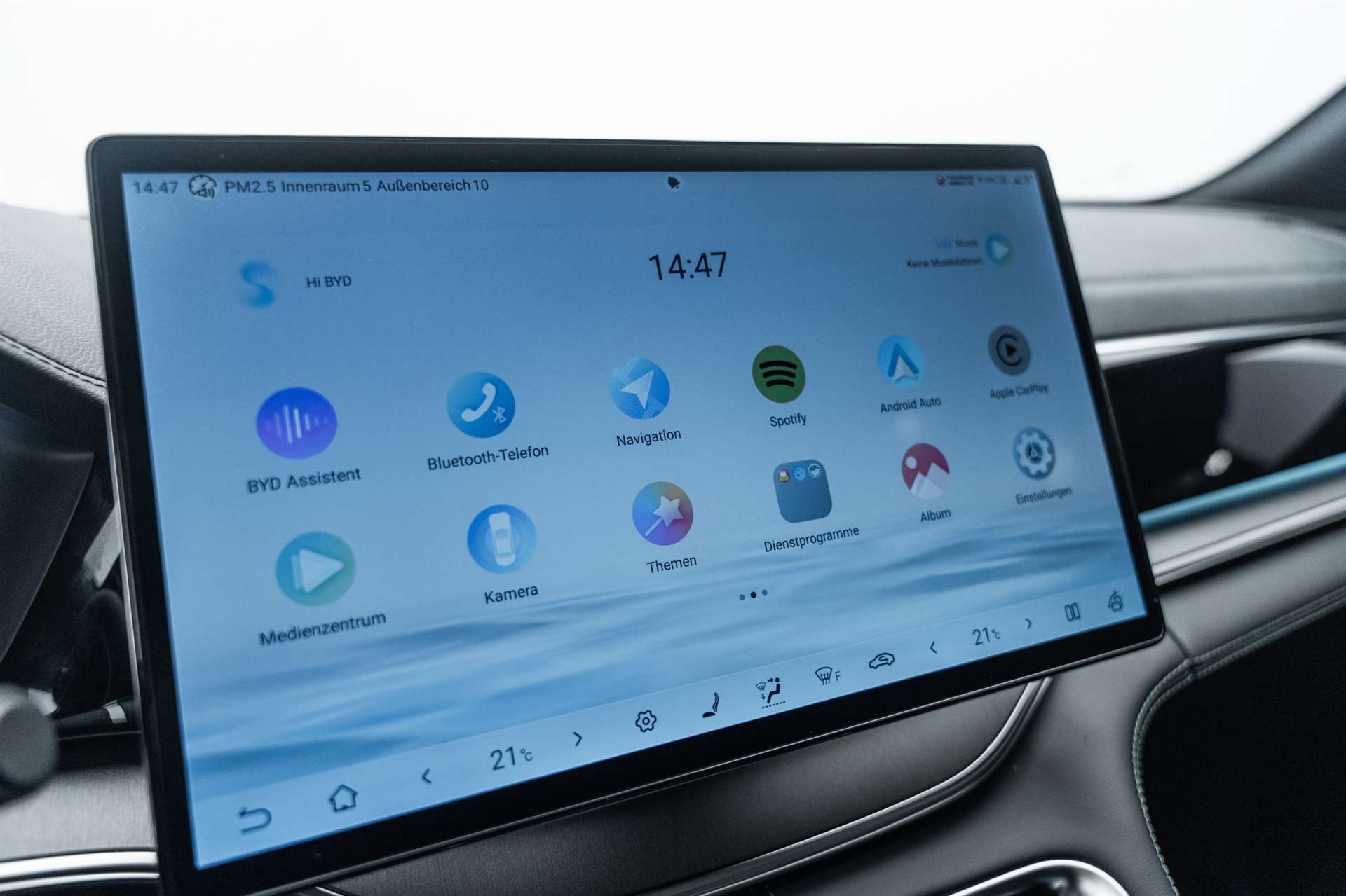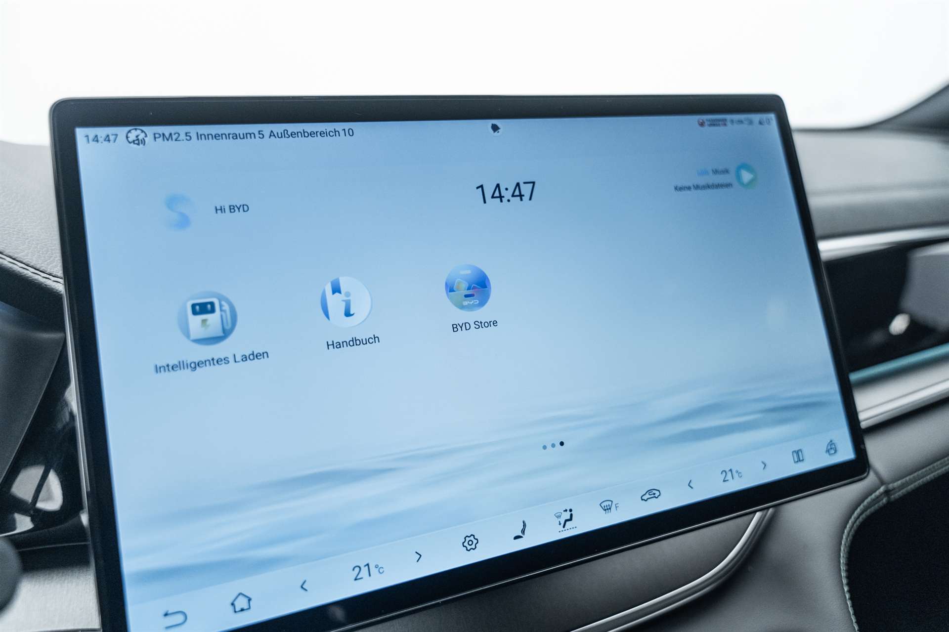 11kW On-Board Charger (OBC), 12-V-Stromanschluss, 2 x Smart Key, 4 x One-Touch-Fensterheber mit Einklemmschutzfunktion, Airbag: Fahrerairbag und Beifahrerairbag, Airbag: Frontairbag in der Mitte, Airbag: Seitenairbags vorn, Airbag: Vorhangairbags, Ambientebeleuchtung, mehrfarbig, Antiblockiersystem (ABS), Armlehne hinten, 2 Getränkehalter, Assist: 360° view camera, Assist: Adaptive Geschwindigkeitsregelung (ACC) & Intelligente Geschwindigkeitsregelung (ICC), Assist: Auto Hold, Assist: Automatische Notbremsung (AEB), Assist: Bergabfahrhilfe (HDC), Assist: Berganfahrassistent (HSA), Assist: Comfort Stop (CST), Assist: Elektrische Parkbremse (EPB), Assist: Heckkollisionswarnung (RCW), Assist: Hydraulischer Bremsassistent (HBA), Assist: Kindererkennung (CPD), Assist: Kontrollierte Verzögerung mit Feststellbremse (CDP), Assist: Müdigkeitserkennung für den Fahrer (DFW) und Aufmerksamkeitswarnung für den Fahrer (DFW), Assist: Parksensoren vorne und hinten, Assist: Querverkehrswarnung hinten (RCTA) & Querverkehrsbremse hinten (RCTB), Assist: Querverkehrswarnung vorn (FCTA) & Querverkehrsbremse vorn (FCTB), Assist: Spurhalteassistent (ELKA), Assist: Spurverlassensverhinderung (LDP), Assist: Spurverlassenswarnung (LDW), Assist: Spurwechselassistent (LCA), Assist: Toter-Winkel-Warnung (BSD), Assist: Traktionskontrolle (TCS), Assist: Überschlagskontrollsystem (RMI), Assist: Verkehrszeichenerkennung (TSR), Assist: Vorwärtskollisionswarnung (FCW), Aussenspiegel elektrisch verstellbar, elektrisch anklappbar, beheizbar, Automatisch abblendender Rückspiegel, Automatisches Verriegelungssystem, Bodenbeleuchtung vorne, Bremsüberbrückungssystem (BOS), Dachreling in Aluminium, Diebstahlsicherung, Dynamische Blinker, Elektrische Heckklappe, Elektronische Bremskraftverteilung (EBD), Elektronische Kindersicherung, ESP (Elektronisches Stabilitätsprogramm), Fahrmodus: Eco, Normal, Sport, Snow, Fahrwerk: Fahrdynamikregelung (VDC), Frontscheibe, Scheibenwischer mit Regensensor, Frontscheibe, UV-Schutz, Wärmedämmung, Schalldämmung, Fussraumbeleuchtung in den Aussenspiegeln, Garantie: Batterie-Garantie 8 Jahre oder 200'000 km, Garantie: Garantie 6 Jahre oder 150'000 km, Gepäckraumleuchte, Getriebe: Direktantrieb, kein Getriebe, Head-up-Display (HUD), ISOFIX und i-Size, Beifahrer- und äussere Rücksitze, Keyless entry & keyless start, Kindersicherung manuell, Klima: Belüftungsdüsen hinten, Kofferraum-Gepäckablage, Kraftbegrenzender Sicherheitsgurt auf dem mittleren Rücksitz, Lackierung: Metallic-Lackierung, LED-Leseleuchten hinten, LED-Leseleuchten vorn, Licht: Fernlichtassistent (HMA), Licht: Follow-me-Home, Licht: LED-Rückleuchten, Licht: LED-Scheinwerfer, automatisches Ein-/Ausschalten, Licht: LED-Tagfahrlicht, Licht: Nebelschlussleuchten, Media: 12,3" TFT-LCD-Instrumententafel, Media: 15,6" elektrisch drehbarer Touchscreen, Media: Android Auto & Apple CarPlay, Media: DAB+ & FM, Media: Infinity-Soundsystem, 10 Lautsprecher, Media: Integrierte 4G-Konnektivität2, Media: Intelligente Sprachsteuerung "Hallo, BYD", Media: Smartphone wireless charging, 2x 15 W, Media: USB-Anschlüsse hinten: 1 x 18W Typ C, 1 x 60 W Typ C, Media: USB-Anschlüsse vorn: 1 x 18W Typ C, 1 x 60 W Typ C, Mehrfarbige LED-Ladeanzeige, Mittelarmlehne hinten, 2 Getränkehalter, Mittelarmlehne vorn, 2 Getränkehalter, Notruf, Panoramadach, elektrisch verstellbares Sonnenschutzrollo, PM2.5 filter, PM2.5-Luftreinigungssystem, Privacy glass in fond, Räder: 19" Bicolor- Leichtmetallfelgen, Reifendruckkontrolle (TPMS), Servolenkung, Sitze: Beifahrersitz belüftet, beheizt, Sitze: Beifahrersitz, elektrisch verstellbar, 4-fach, Sitze: Fahrersitz belüftet, beheizt, gespeicherte Einstellung, Sitze: Fahrersitz und Beifahrer, integrierte Kopfstütze, Sitze: Fahrersitz, elektrisch verstellbar, 8-fach, Positionsspeicher, Sitze: Rücksitze 40:60 geteilt umklappbar, Sitze: Rücksitze, manuell einstellbare Kopfstütze, Türöffnungswarnung (DOW), Vier LED-Türleuchten, Vordersitz-Sonnenblenden mit beleuchtetem Schminkspiegel, Vorgespannte und kraftbegrenzende Sicherheitsgurte vorn, Wärmepumpe