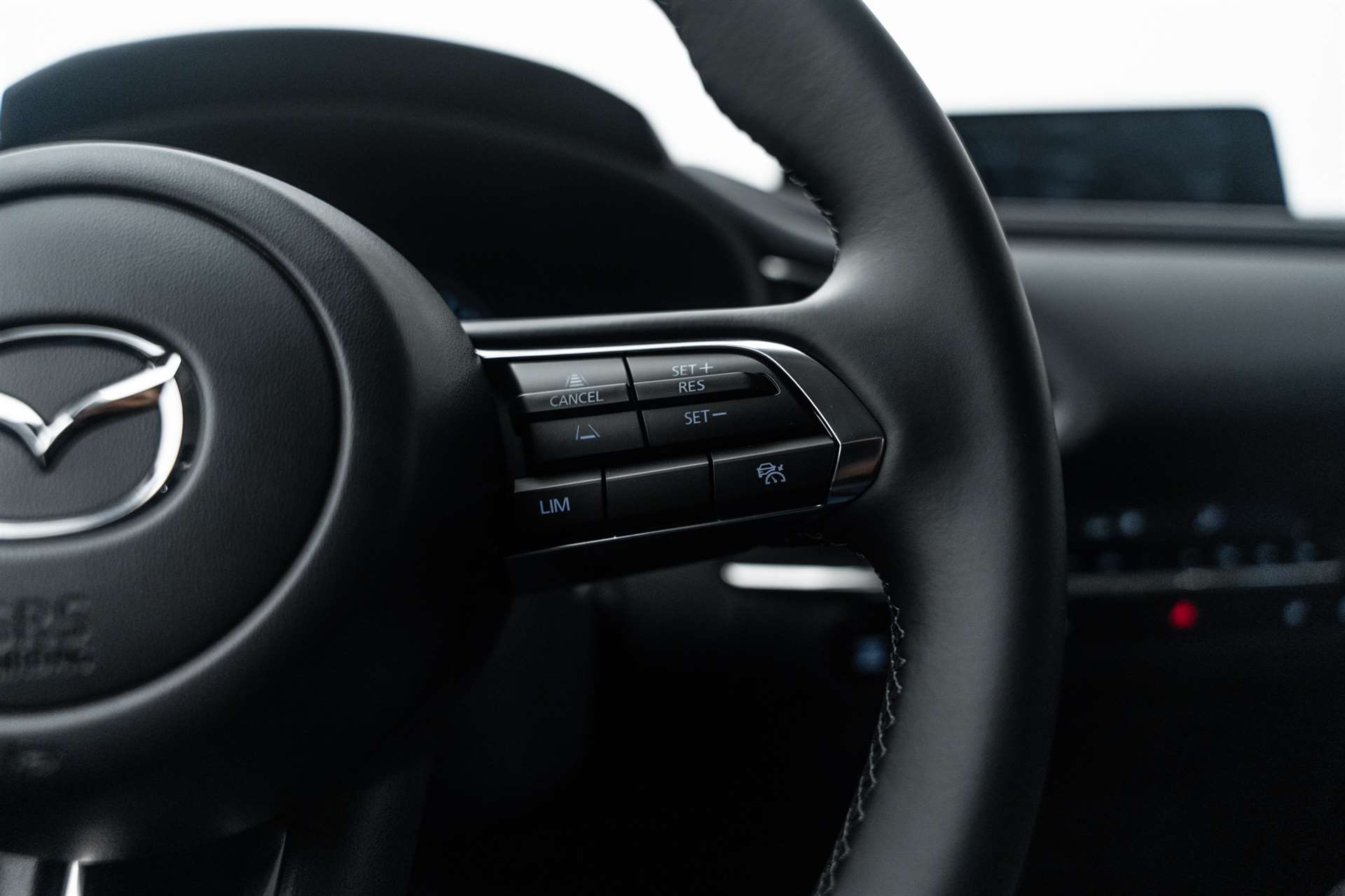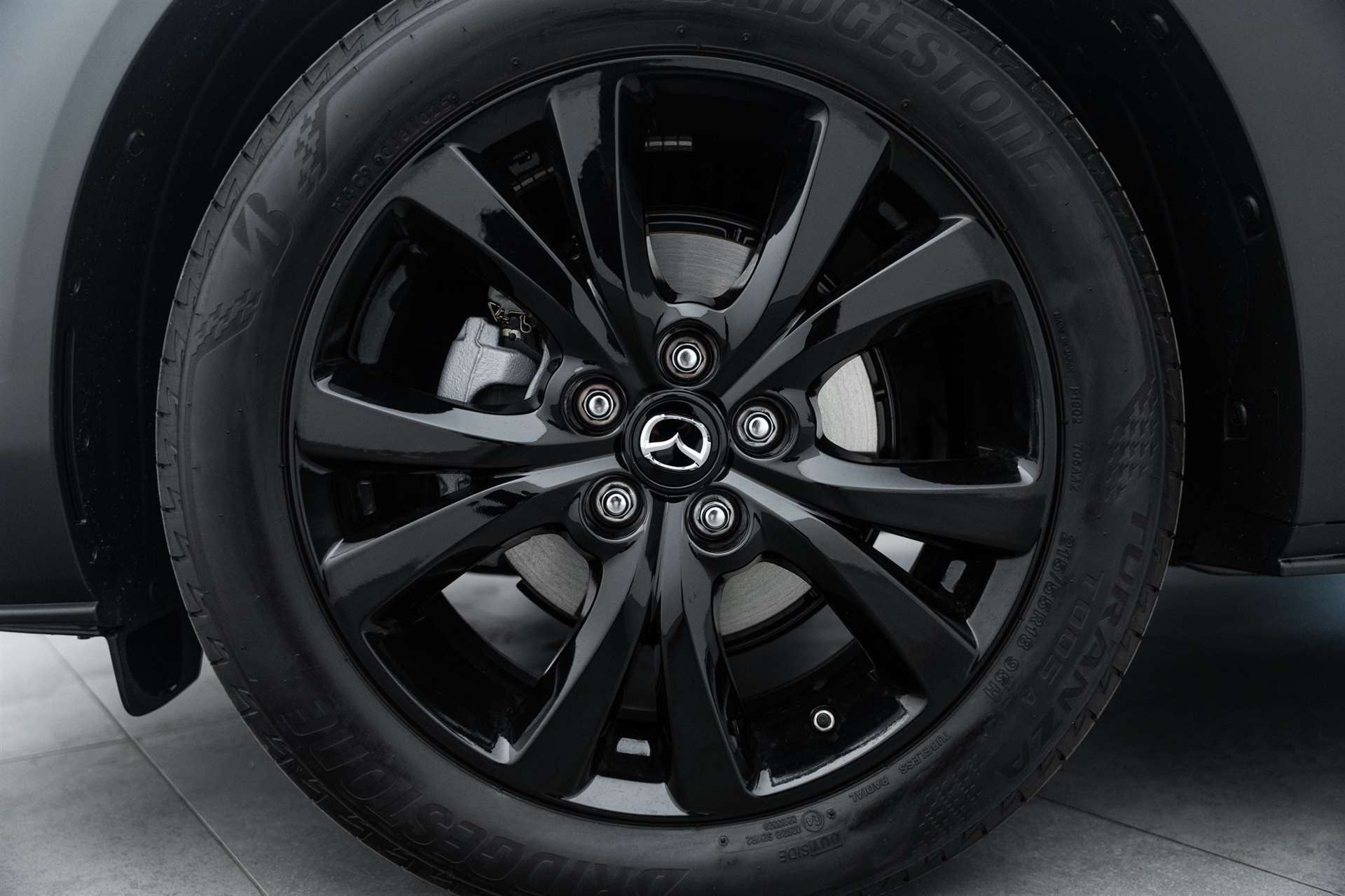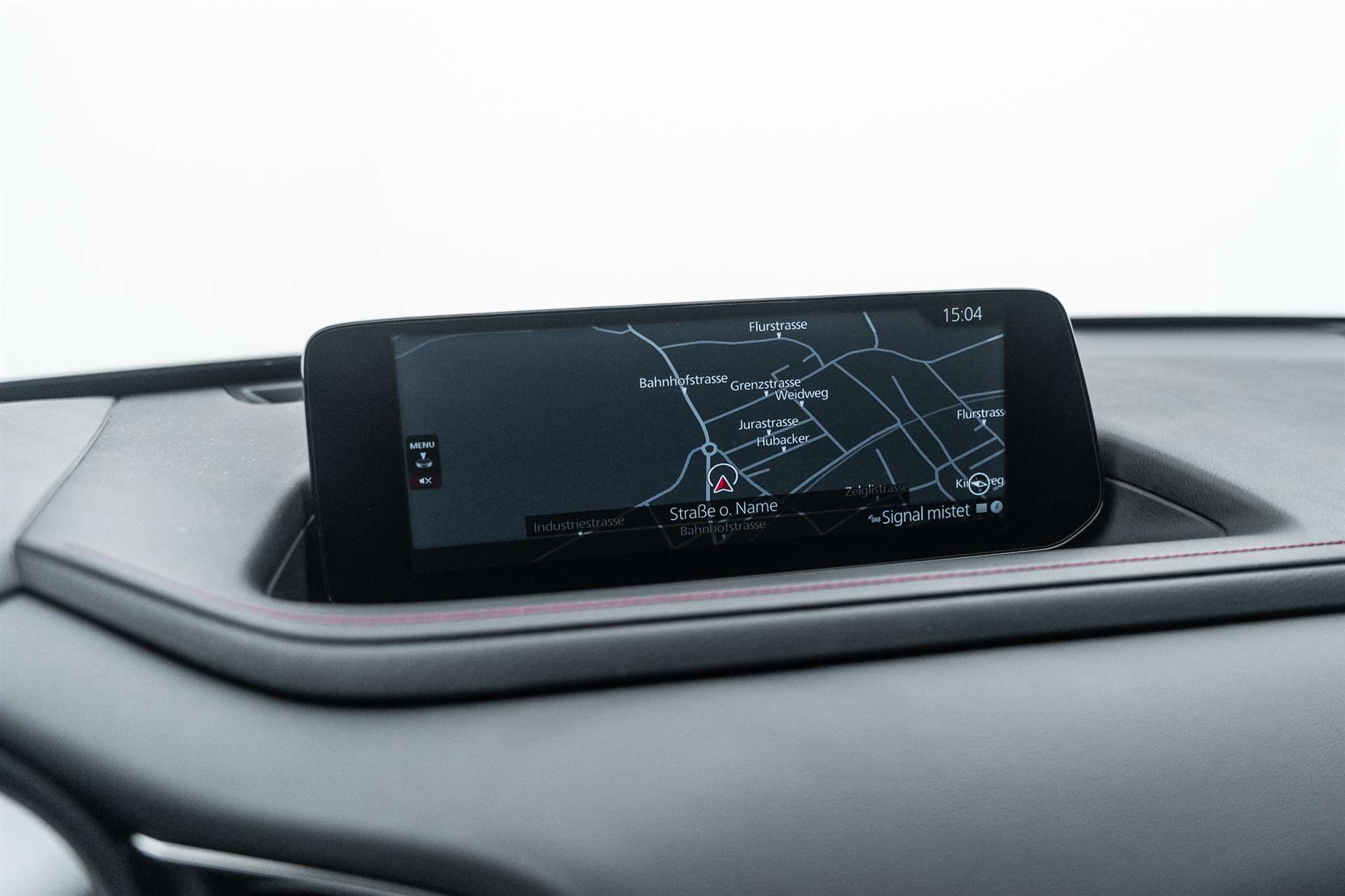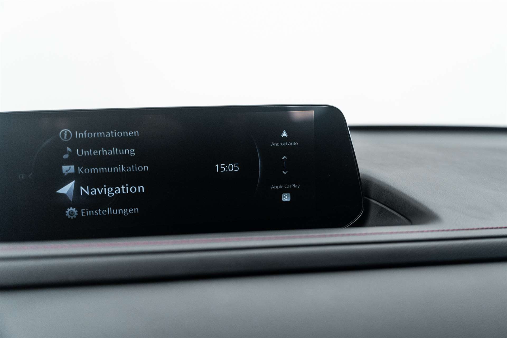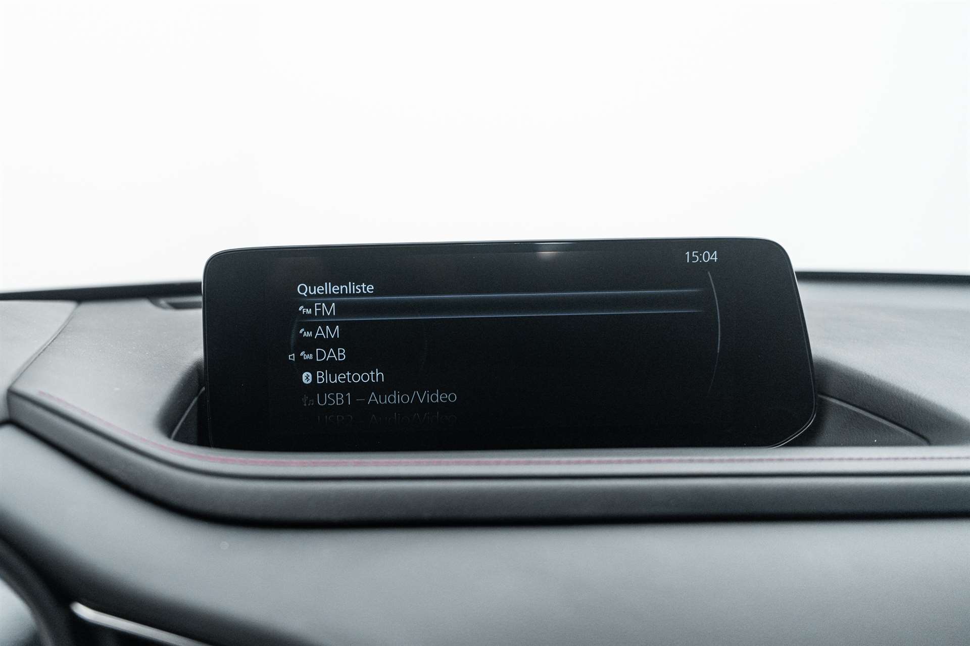 Ablagetasche (Rückseite Beifahrersitz), ABS, Airbag: Airbag Fahrer und Beifahrer, Airbag: Fahrer-Knie-Airbag, Airbag: Seitenairbags vorne, Airbag: Vorhang vorn-hinten, Alarmanlage, Assist: Adaptive Geschwindigkeitsautomatik MRCC (Mazda Radar Cruise Control) mit Stop & Go-Funktion, Assist: Aufmerksamkeitswarner DAA (Driver Attention Alert), Assist: City-Notbremsassistent SCBS mit Fussgänger- und Fahrraderkennung, Assist: Dynamische Stabilitätskontrolle (DSC) und Traktionskontrolle (TCS), Assist: Einparkhilfe mit Parksensoren hinten, Assist: Einparkhilfe mit Parksensoren vorne, Assist: Elektronische Parkbremse mit Auto-Hold-Funktion und Berganfahrhilfe, Assist: Intelligente Geschwindigkeitsautomatik und Geschwindigkeitsbegrenzer mit Verkehrszeichen, Assist: Pre-Crash Safety mit aktivem Bremseingriff SBS (Smart Brake Support), Assist: Rückfahr-Querverkehrswarner (RCTA, Rear Cross Traffic Alert), Assist: Rückfahrkamera, Assist: Spurhalteassistent LAS (Lane-keep Assist System) mit aktiver Lenkunterstützung, Assist: Spurwechselassistent (BSM, Blind Spot Monitoring) mit Totwinkelwarner, Assist: Verkehrszeichenerkennung (TSR, Traffic Sign Recognition), Aussenspiegel beheizbar und automatisch einklappbar, Aussenspiegel in Brilliant Black, Blenden im Seitenfensterbereich in Brilliant Black, Bordcomputer, Dachheckspoiler in Brilliant Black, Dekor: Interieur Schwarz mit roten Ziernähten, Dunkel getönte Scheiben hinten (Privacy Glass), eCall, Elektrische Fensterheber vorn und hinten mit Automatikfunktion, Elektrische Heckklappe, Fahrwerk: G-Vectoring Control Plus, die Fahrdynamikregelung von Mazda, Garantie: 6 Jahre oder 150'000 km, Getriebe: 6-Gang-Automat, Head-up-Display mit Projektion auf die Windschutzscheibe, i-stop, das intelligente Stopp-Start-System von Mazda, Innenspiegel automatisch abblendbar, Isofix-Kindersitzverankerungen (2x), Keyless Entry mit Smart Key, Klima: 2-Zonen-Klimaautomatik mit Ventilation hinten, Kosmetikspiegel auf Beifahrerseite und Fahrerseite, beide beleuchtet, Kühlergrill in Brilliant Black, Lackierung: Uni-Lackierung, LED-Innenbeleuchtung, Lederlenkrad und -schaltknauf, Lenkrad: Lenkrad längs- und höhenverstellbar, Lenkrad: Multifunktionslenkrad, Licht: Fernlichtautomatik (HBC, High-Beam Control), Licht: LED-Rückleuchten, Licht: Lichtautomatik, Licht: Scheinwerfer mit Coming-/Leaving-Home-Funktion, Licht: Voll-LED-Scheinwerfer, Mazda M Hybrid, Mild-Hybridsystem (M-HEV) mit Bremsenergie-Rückgewinnung, Media: 8 Lautsprecher, Media: Apple CarPlay wireless und Android Auto wireless, Media: Audiosystem mit DAB+-Radio, 2x USB- C- und 12-V-Anschluss, Media: Bluetooth für Smartphones und Audiogeräte, Media: Instrumentenanzeige mit 7'-TFT-Multidisplay, Media: Mazda Connect mit 10,25'-TFT-Farbdisplay, Media: Mazda Connected Services, Media: Multi Commander HMI auf der Mittelkonsole, Media: MyMazda App, Media: Navigationssystem, Media: Wireless-Ladestation (für Smartphones mit Qi-Standard), Mittelarmlehne vorne mit Ablagefach, Motor-Startknopf, Polster: Stoffsitze in Schwarz mit roten Ziernähten, Räder: Leichtmetallfelgen 18" Farbe Black Metallic 215/55 R18, Räder: Reifendruckkontrollsystem, Räder: Reifenreparatur-Set (Tire Fit), Scheibenwischer mit integrierter Waschdüse, Scheibenwischer mit Regensensor, Servolenkung, Sitze: Beifahrersitz höhenverstellbar, Sitze: Fahrersitz in Höhe und Sitzkissen in Neigung verstellbar, Sitze: Rücksitzlehnen getrennt abklappbar 60:40, Sitze: Vordersitze heizbar, Zentralverriegelung mit Fernbedienung