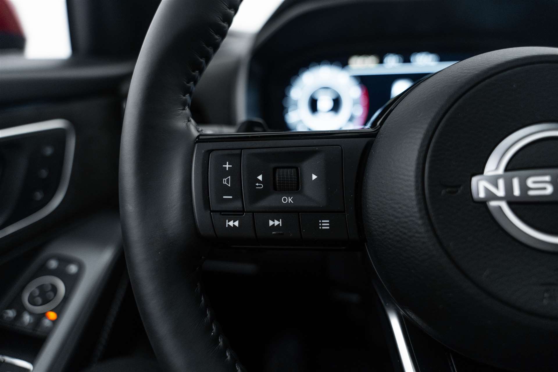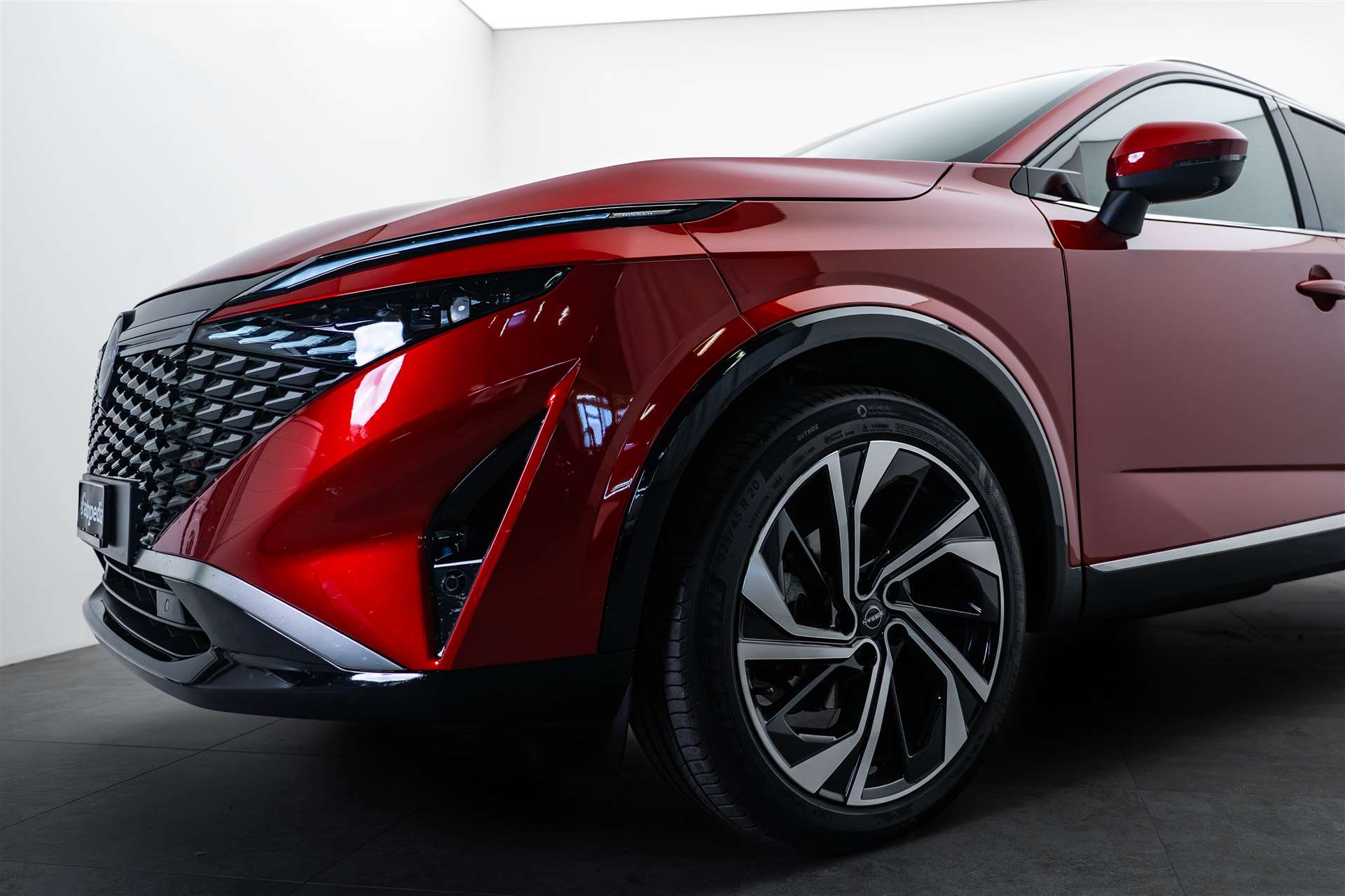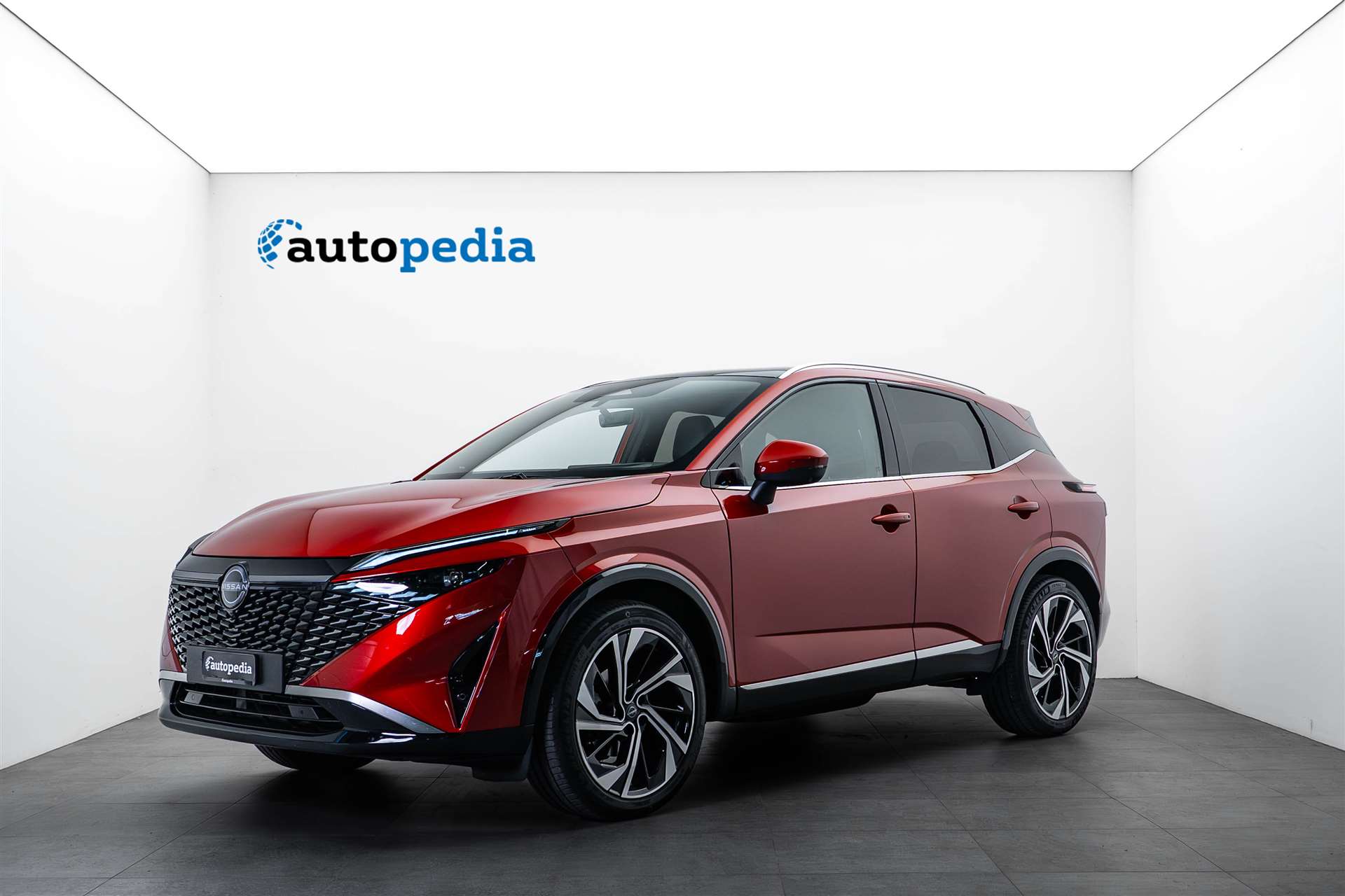 3-Punkt-Sicherheitsgurte auf allen Plätzen, 6 Verzurrösen im Kofferraum, Ablagen in den Türen, Airbag: Airbag Fahrer und Beifahrer, Airbag: Seitenairbag für Fahrer und Beifahrer, Airbag: Window-Kopfairbags vorne und hinten, Airbag: Zentralairbag, Antiblockiersystem (ABS) mit elektronischer Bremskraftverteilung (EBD), Assist: Auto-Hold-Funktion, Assist: Berganfahr-Assistent, Assist: Einparkhilfe vorne und hinten, Assist: Elektronische Parkbremse (e-PKB) mit automatischer Deaktivierung beim Anfahren, Assist: Intelligente Müdigkeitserkennung, Assist: Intelligenter Adaptiver Geschwindigkeits- und Abstands-Assistent, Assist: Intelligenter autonomer Notbrems-Assistent hinten -, Assist: Intelligenter autonomer Notbrems-Assistent vorne mit Fussgänger-und Velofahrererkennung und-, Assist: Intelligenter Frontkollisionswarnungs-Assistent, Assist: Intelligenter Spurhalte-Assistent aktiv mit korrigierendem Bremseingriff, Assist: Querverkehrswarner, hinten, Assist: Rückfahrkamera in Farbe, Assist: Totwinkel-Assistent aktiv mit korrigierendem Bremseingriff, Assist: Verkehrszeichenerkennung, Assist: Warnblinkautomatik, Ausklappbare Mittelarmlehne hinten mit 2 Getränkehaltern, Aussenspiegel automatisch einklappbar, Aussenspiegel rechts und links beheizbar und elektrisch verstellbar, Beleuchtetes Handschuhfach, Dachhimmel in Hellgrau, Drehzahlmesser, Elektrische Fensterheber vorne + hinten, Elektronisches Stabilitäts-Programm (ESP), Fahrer-Informationssystem mit 12.3"-TFT-Bildschirm, Fahrmodi: Standard, Sport, Eco, Flexi-Board: Modulares Verstausystem im Kofferraum, Garantie: 12 Jahre Garantie gegen Durchrostung, Garantie: Garanie 3 Jahre Lackgarantie, Garantie: Garanie 3 Jahre oder 100'000 km (ab 1. Inv.), Getriebe: Xtronic Automatikgetriebe, Heckscheiben-Wisch-/Waschanlage, Heckscheibenheizung, Innenspiegel automatisch abblendbar, INTELLIGENT KEY-, ISOFIX-Kindersitz-Befestigungspunkte auf den hinteren Sitzplätzen inkl. Top-Tether, Katalysator geregelt, Kleiderhaken im Fahrgastraum, Klima: 2-Zonen-Klimaautomatik, Kniepolsterung an der Mittelkonsole, Kofferraumbeleuchtung, Lackierung: Uni-Lackierung, LED-Ambientebeleuchtung in der Mittelkonsole, Lenkrad: Lenkrad und Schalthebelknauf, lederummantelt, Lenkrad: Lenkradfernbedienung für :, Lenkrad: Lenkradfernbedienung für:, Lenkrad: Schaltwippen, Lenksäule, höhen- und tiefenverstellbar, Leselampe, vorne und hinten, Licht: Dritte Bremsleuchte, Licht: Fahrlichtautomatik, Licht: Fernlicht-Assistent, Licht: LED-Nebelscheinwerfer, Licht: LED-Nebelschlussleuchte, Licht: LED-Rückleuchten, Licht: LED-Scheinwerfer, Licht: LED-Tagfahrlicht, Media: 6 Lautsprecher, Media: Bluetooth-Schnittstelle für Mobiltelefon und Audiostreaming, Media: Digitaler Radioempfang (DAB/DAB+), Media: Haifischantenne, Media: NissanConnect Navigationssystem:, Media: NissanConnect Services Infotainment:, Media: USB-Anschluss (Typ A und Typ C) hinten, Media: USB-Anschluss (Typ A) in der Mittelkonsole, Media: USB-Anschluss (Typ C) in der Mittelkonsole, Notruf und Pannenanruf (eCall), Paket: Connect-/Winter-Paket, Paket: Winter Paket, Perimetrische Alarmanlage, Pollenfilter (Staubfilter), Polster: Sitzbezüge Stoff, Räder: 18"-Leichtmetallfelgen, Räder: Reifendruck-Kontrollsystem (TPMS), Räder: Reifenreparatur-Set, Scheibenwischer mit Intervall schaltung und Regensensor vorne, Servolenkung, Sitze: Beifahrersitz höhenverstellbar, Sitze: Fahrersitz höhenverstellbarr, Sitze: Fahrersitz mit 2-fach elektrischer einstellbarer Lendenwirbelstütze, Sitze: Kopfstützen auf allen Plätzen, Sitze: Rückenlehne asymmetrisch (60:40) umklappbar, Sonnenblende Fahrer und Beifahrerseite mit beleuchtetem Spiegel, Sonnenblenden mit Make-Up-Spiegel auf Fahrer- und Beifahrerseite, Sonnenbrillenfach, Steckdose im Kofferraum, Steckdose, 12 Volt, vorne, Stopp-/Start-System, Verdunkelte Seitenscheiben ab B-Säule, Warnsignal für nicht angelegte Sicherheitsgurte, Wegfahrsperre elektronisch, Zentralverriegelung mit Funkfernbedienung