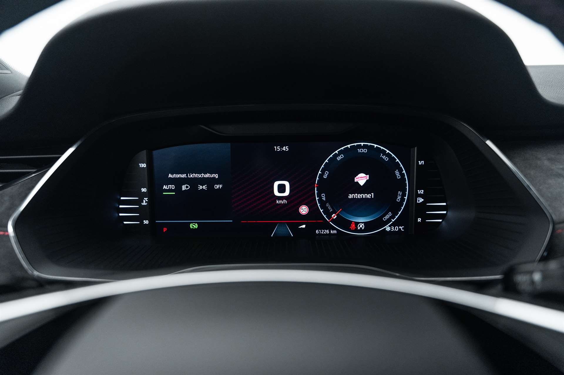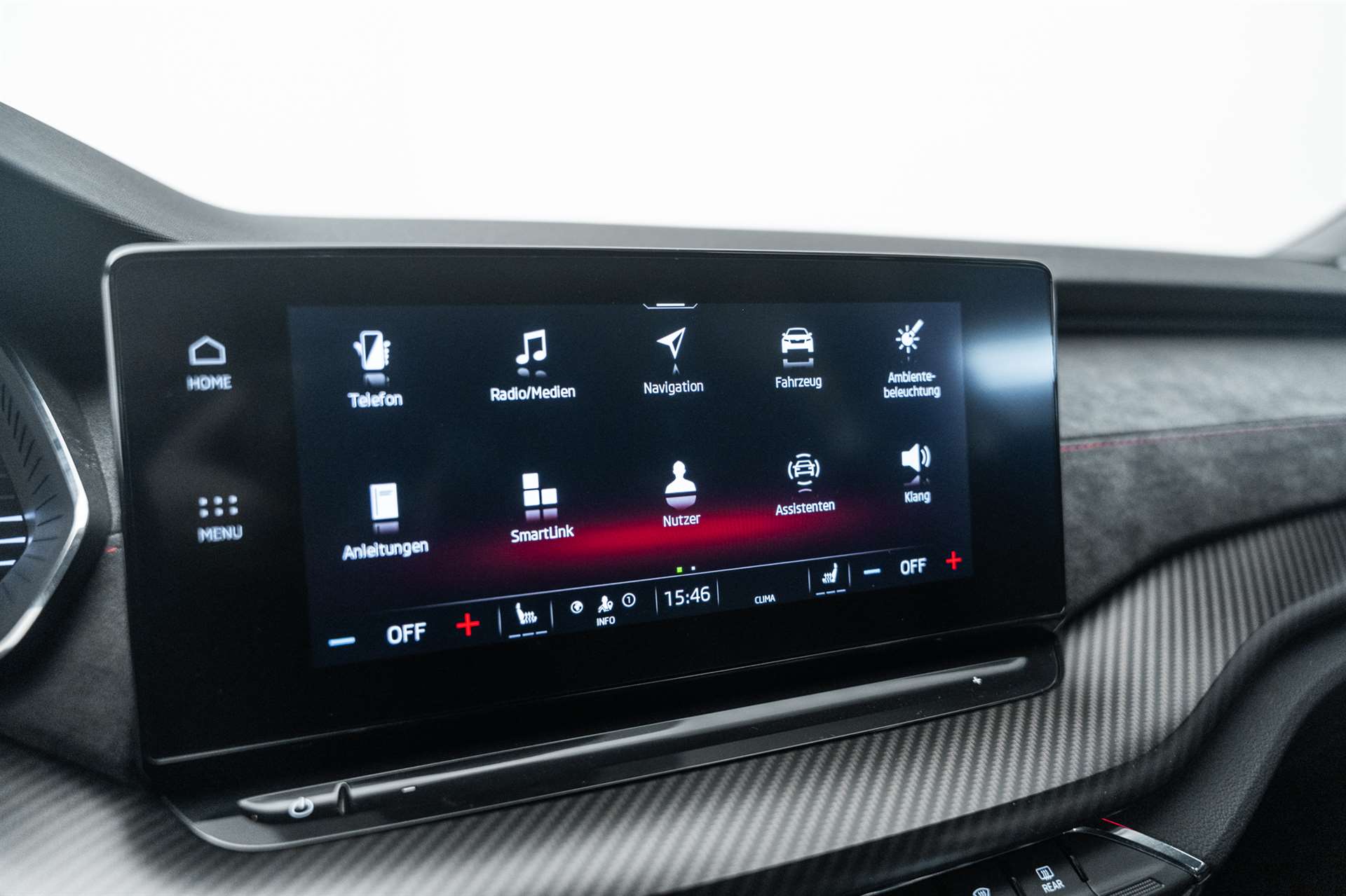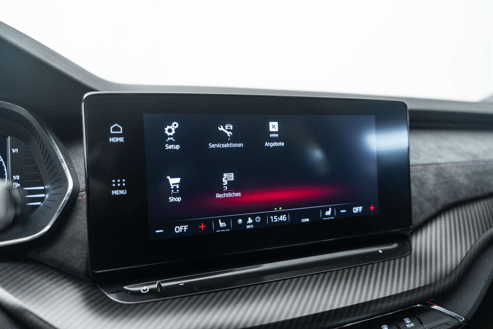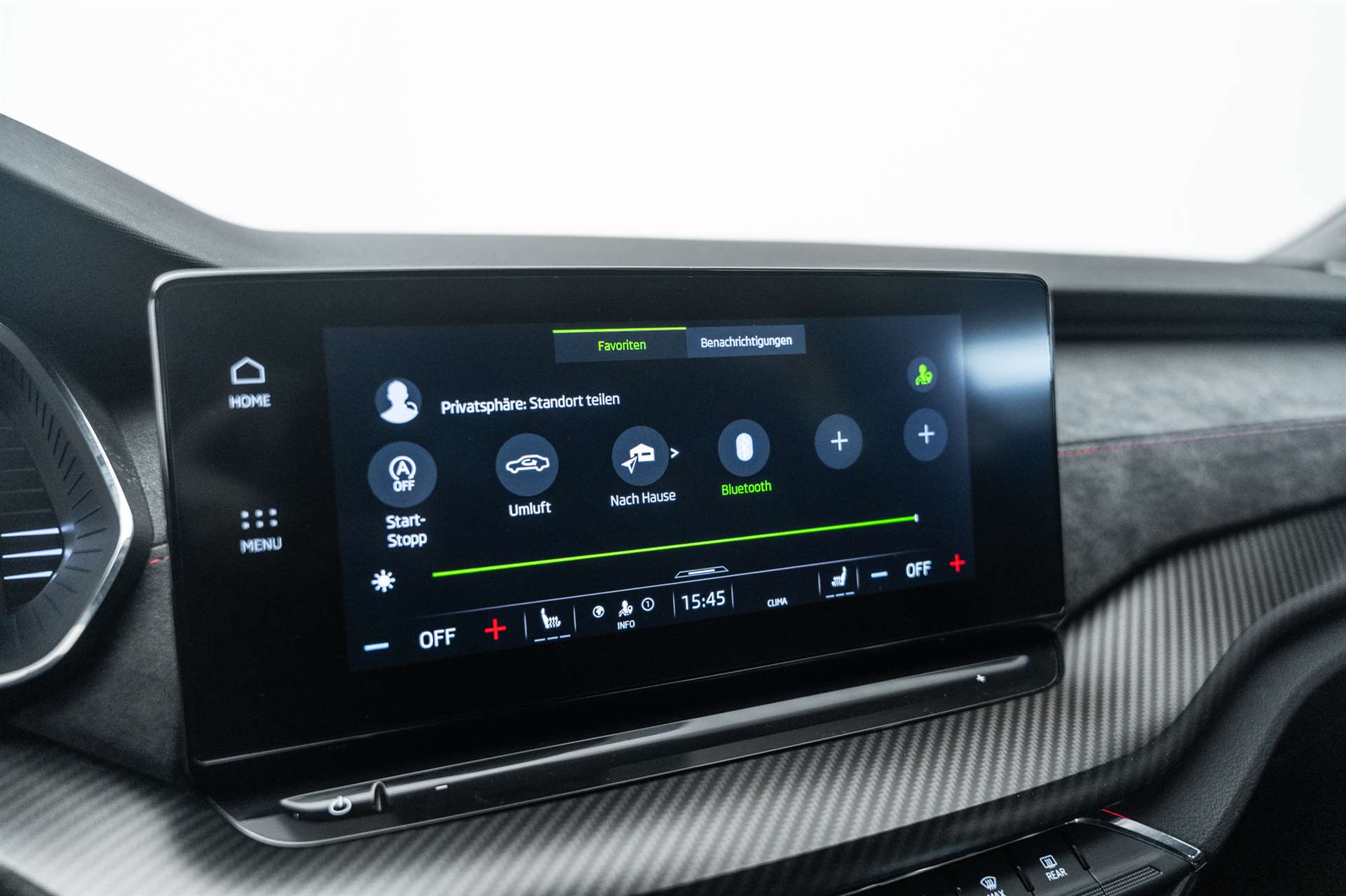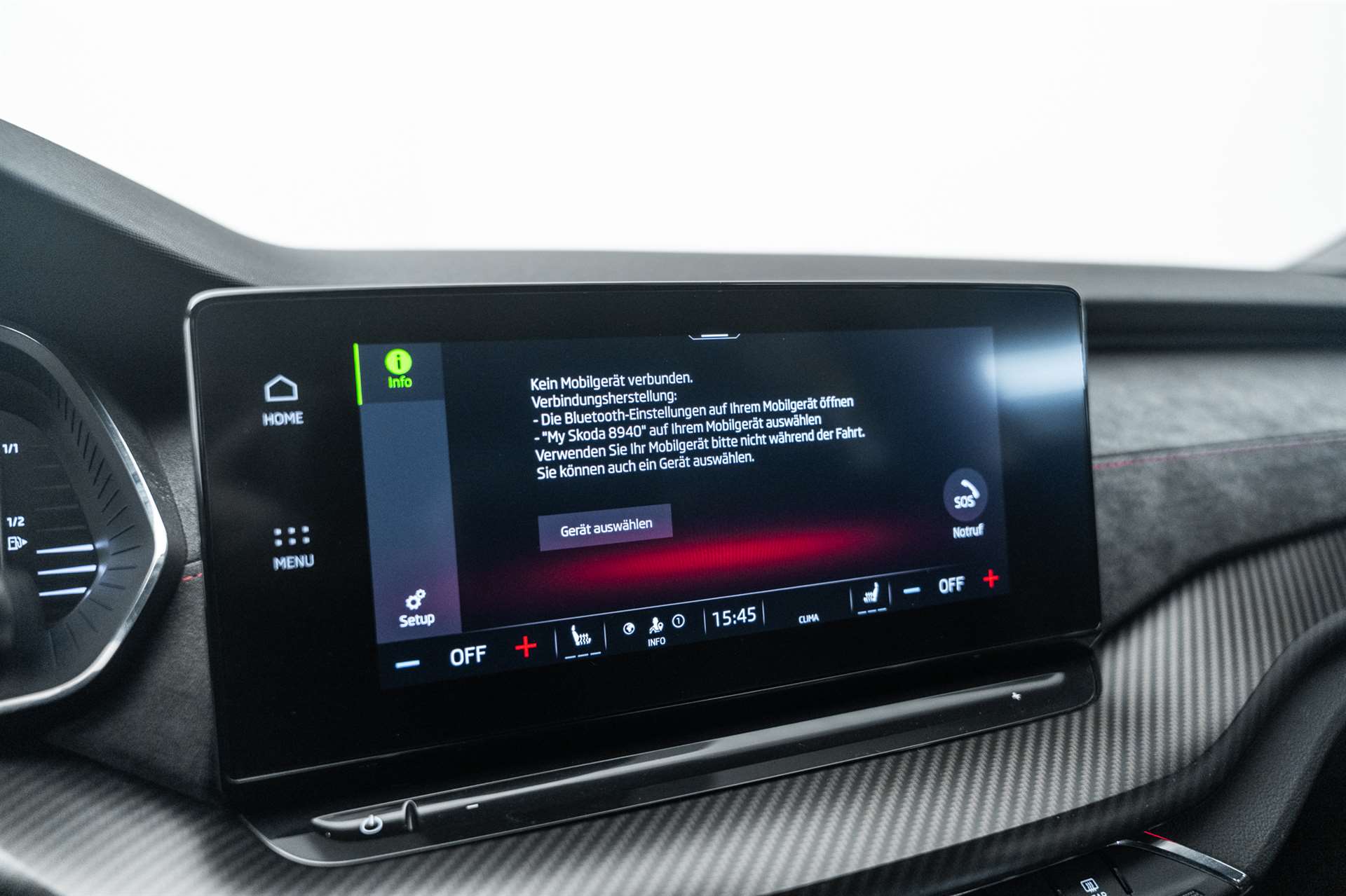 Räder: Leichtmetallräder 7,5 J x 18" "COMET", schwarz mit polierter Oberfläche, Lenkrad: 3-Speichen-Supersport-Leder-Multifunktionslenkrad mit Schaltwippen (DSG), beheizbar, Paket: Simply Clever Paket, SKODA Care: MobilitätPLUS (Ersatzmobilität für die Dauer der Wartung) für 4 Jahre / 100000 km, Vorbereitung für Anhängevorrichtung, Paket: Schlafpaket, 2 spezielle Kopfstütze hinten, Decke, Sonnenschutzrollo für Seitenscheiben hinten-, Lackierung: Metallic-Lackierung, Lackierung: Perleffekt-Lackierung, Alarmanlage mit Innenraumüberwachung und Neigungssensor, Steckdose 230 V, zusätzliche 3 USB C-Anschlüsse, Frontscheibenheizung, SKODA Garantie: Garantie +1 Jahr / 100'000 km, Media: Soundsystem CANTON, SKODA Garantie: Garantie +2 Jahre / 100'000 km (ab 1. Inv.), Paket: Safety Pack RS, Assist: Spurwechselassistent "Side Assist", Assist: Proaktives Insassenschutzsystem "Crew Protect Assistant" vorne und hinten, Assist: Müdigkeitserkennung, Licht: LED-Nebelscheinwerfer mit integrierter Corner Funktion, Airbag: Seitenairbags hinten, Räder: Leichtmetallräder 7,5 J x 19" «ALTAIR», antrazit mit polierter Oberfläche, Lackierung: Sonderlackierung Metallic, Paket: Schlafpaket Premium, 2 spezielle Kopfstütze hinten, Decke, Sonnenschutzrollo für Seitenscheiben hinten-, Berührungsloses Öffnen der Heckklappe (Virtual Pedal) inkl. halbautomatische Kofferraumrollo, Anhängerkupplung, mechanisch anklappbar mit elektrischer Entriegelung, Fahrwerk: Adaptive Fahrwerksregelung "Dynamic Chassis Control" inkl. "Driving Mode Selection", Klima: Standheizung mit Fernbedienung, Panorama-Schiebedach, Paket: mySKODA Pack RS, Phonebox und Wireless Charging, Assist: Adaptiver "Lane Assist", Assist: Spurwechselassistent "Side Assist", Assist: TRAVEL ASSIST: Verkehrszeichenerkennung/Stauassistent und Emergency Assist, WLAN und LTE Antenne für High Speed Internet, Licht: LED-Nebelscheinwerfer mit integrierter Corner Funktion, Assist: Rückfahrkamera, Assist: Predictive Cruise Control (PCC), Tür und Seitenverkleidung mit Regenschirm auf Fahrerseite, Akustikpaket, Ladeboden variabel, SKODA Garantie: Garantie +3 Jahre / 150'000 km (ab 1. Inv.), SKODA Care: Service (Wartung & Verschleiss) für 4 Jahre / 100000 km, SKODA Care: Räder (Radwechsel und Reifenersatz) für 4 Jahre / 100000 km, Paket: Relax Pack RS, Klima: 3-Zonen-Klimatisierungsautomatik, Sitze: Fahrer- und Beifahrersitz elektrisch einstellbar, mit Memoryfunktion, Netzprogramm und Cargoelemente, Sitze: Vorder- und Rücksitze Beheizbar, Sitze: Ergositze RS inkl. Sitzbezüge Alcantara/Leder, SKODA Care: ServicePLUS (Wartung, Verschleiss & Flüssigkeiten) für 4 Jahre / 100000 km, SKODA Care: RäderPLUS (Radwechsel, Reifenersatz und Radeinlagerung) für 4 Jahre / 100000 km, SKODA Care: Reifen (Reifenwechsel und Reifenersatz) für 4 Jahre / 100000 km, SKODA Care: ReifenPLUS (Reifenwechsel, Reifenersatz und Reifeneinlagerung) für 4 Jahre / 100000 km