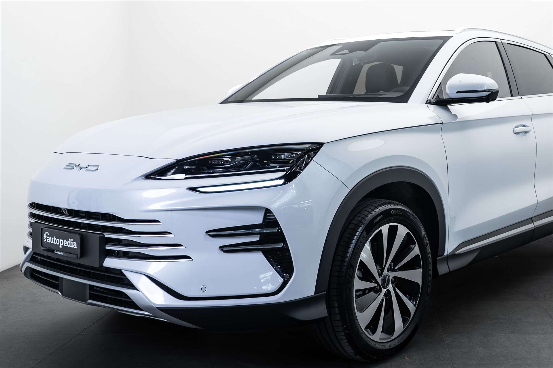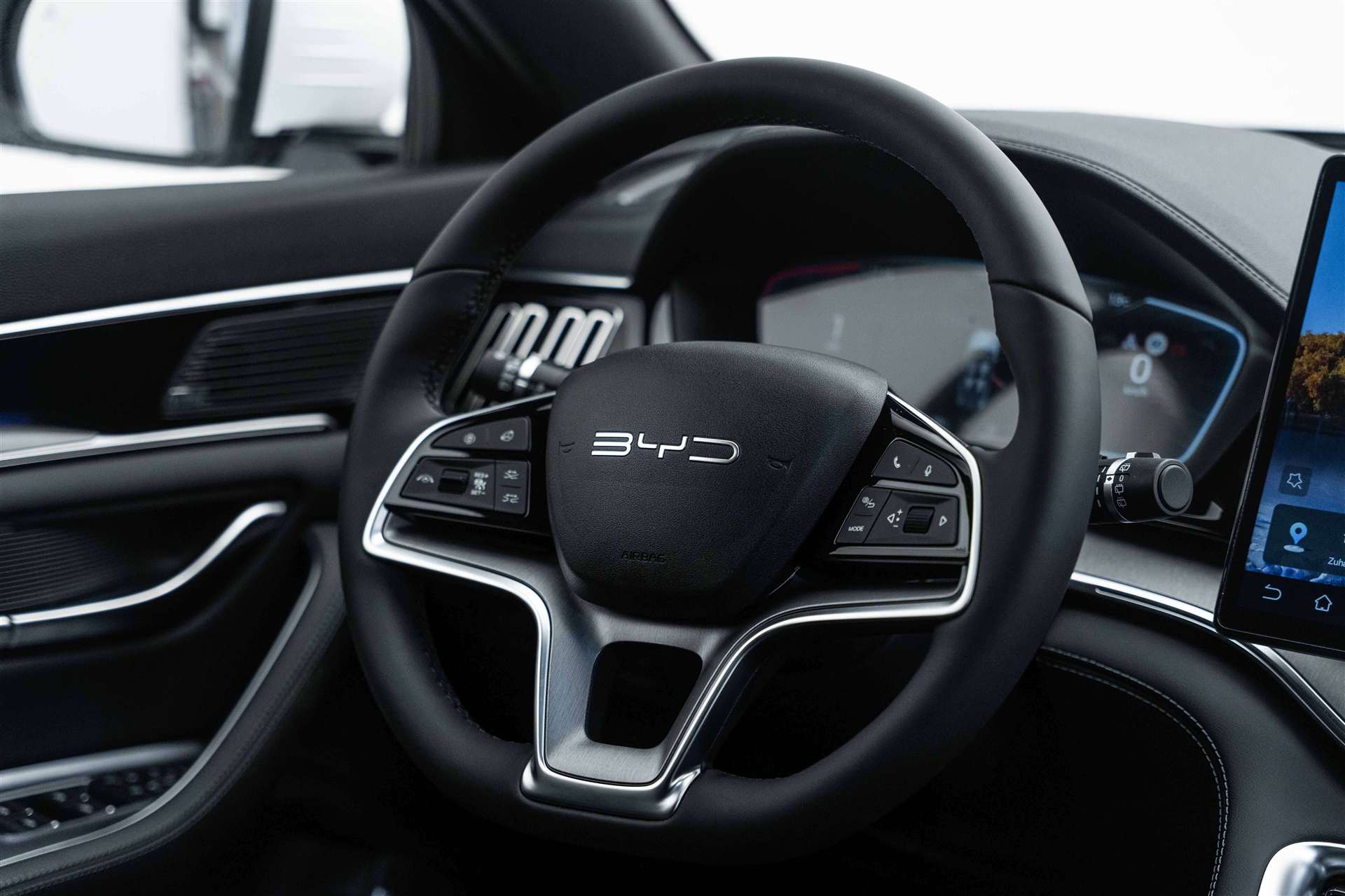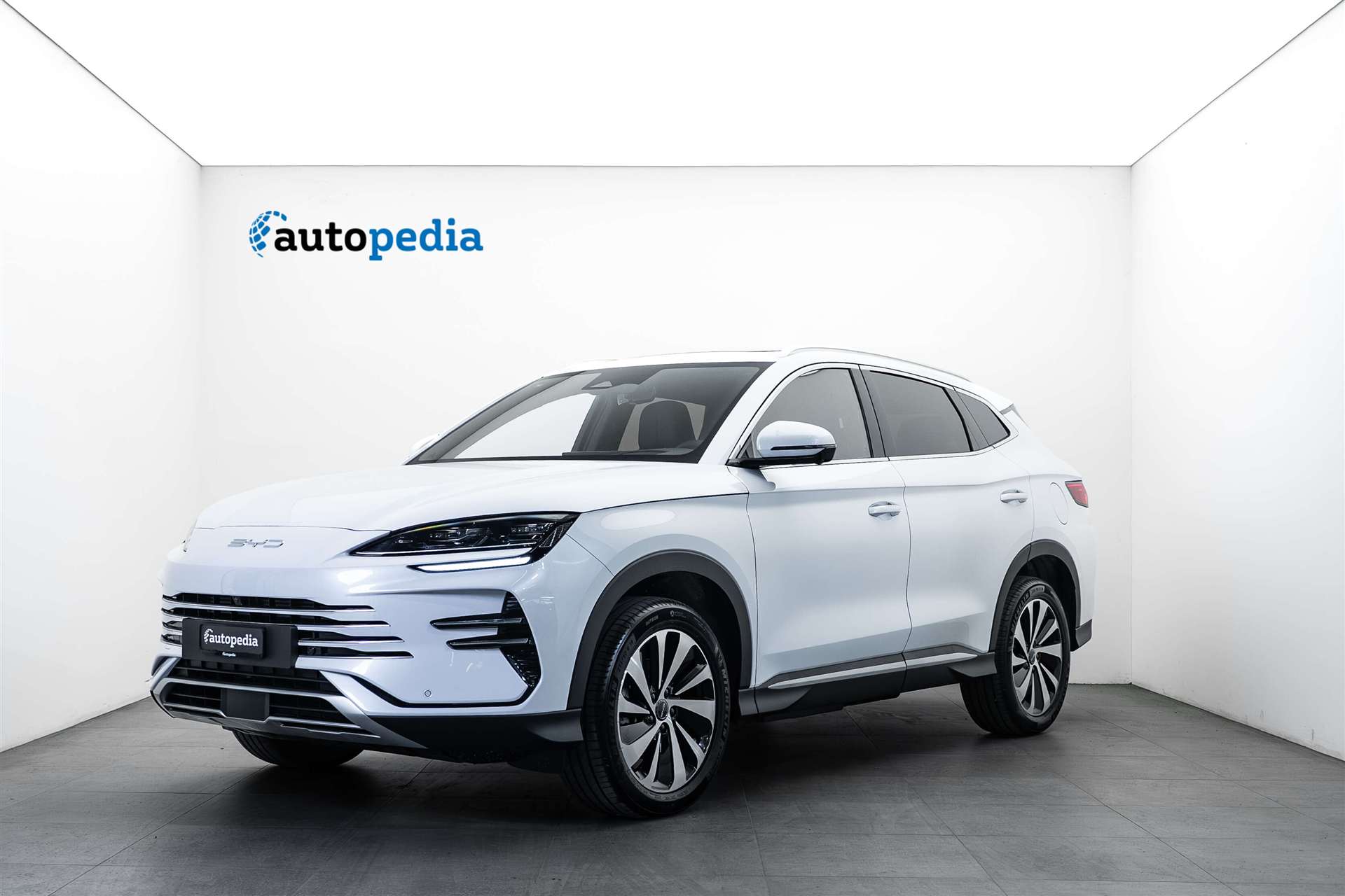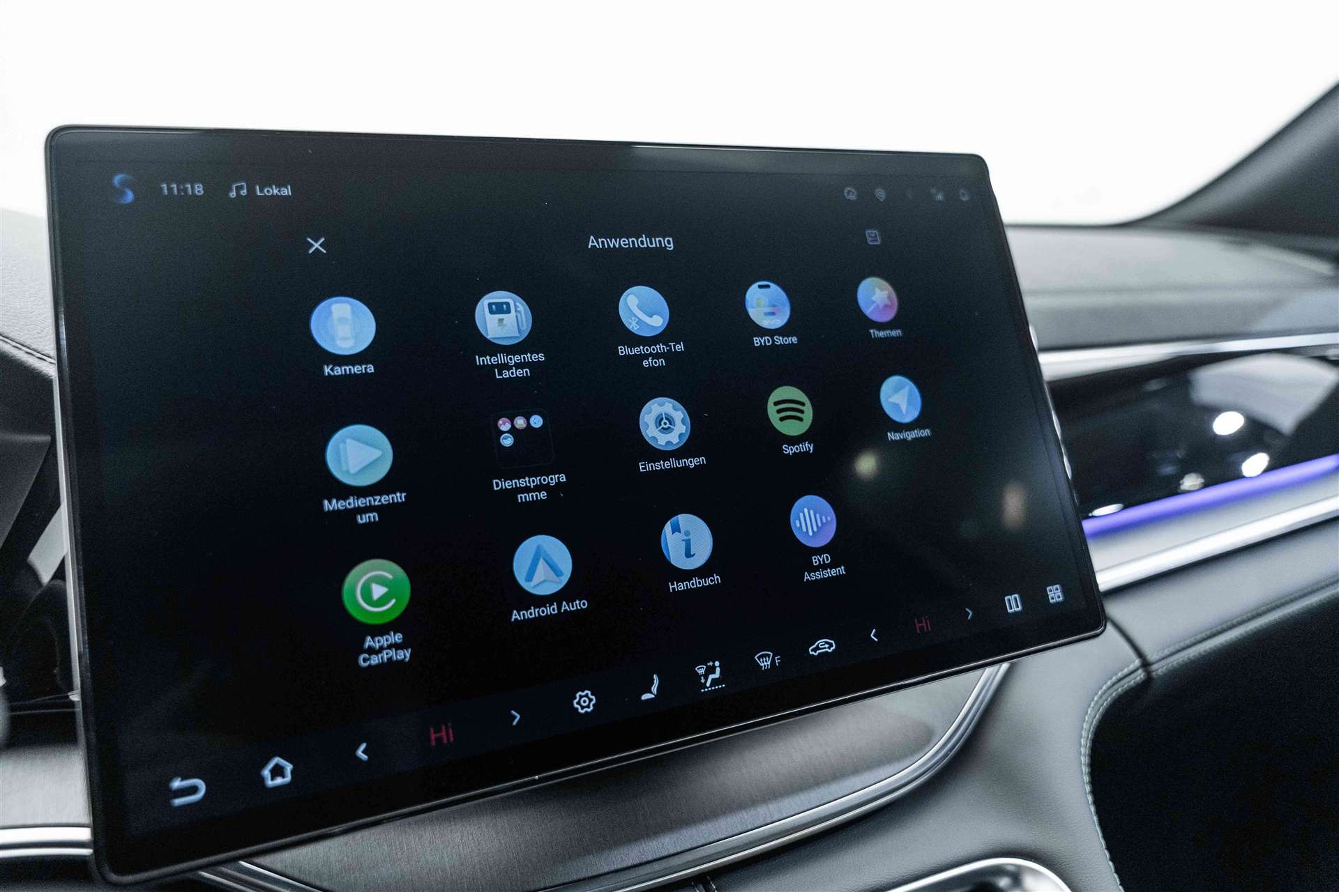 11kW On-Board Charger (OBC), 12-V-Stromanschluss, 2 x Smart Key, 4 x One-Touch-Fensterheber mit Einklemmschutzfunktion, Airbag: Fahrerairbag und Beifahrerairbag, Airbag: Frontairbag in der Mitte, Airbag: Seitenairbags vorn, Airbag: Vorhangairbags, Ambientebeleuchtung, mehrfarbig, Antiblockiersystem (ABS), Armlehne hinten, 2 Getränkehalter, Assist: 360° view camera, Assist: Adaptive Geschwindigkeitsregelung (ACC) & Intelligente Geschwindigkeitsregelung (ICC), Assist: Auto Hold, Assist: Automatische Notbremsung (AEB), Assist: Bergabfahrhilfe (HDC), Assist: Berganfahrassistent (HSA), Assist: Comfort Stop (CST), Assist: Elektrische Parkbremse (EPB), Assist: Heckkollisionswarnung (RCW), Assist: Hydraulischer Bremsassistent (HBA), Assist: Kindererkennung (CPD), Assist: Kontrollierte Verzögerung mit Feststellbremse (CDP), Assist: Müdigkeitserkennung für den Fahrer (DFW) und Aufmerksamkeitswarnung für den Fahrer (DFW), Assist: Parksensoren vorne und hinten, Assist: Querverkehrswarnung hinten (RCTA) & Querverkehrsbremse hinten (RCTB), Assist: Querverkehrswarnung vorn (FCTA) & Querverkehrsbremse vorn (FCTB), Assist: Spurhalteassistent (ELKA), Assist: Spurverlassensverhinderung (LDP), Assist: Spurverlassenswarnung (LDW), Assist: Spurwechselassistent (LCA), Assist: Toter-Winkel-Warnung (BSD), Assist: Traktionskontrolle (TCS), Assist: Überschlagskontrollsystem (RMI), Assist: Verkehrszeichenerkennung (TSR), Assist: Vorwärtskollisionswarnung (FCW), Aussenspiegel elektrisch verstellbar, elektrisch anklappbar, beheizbar, Automatisch abblendender Rückspiegel, Automatisches Verriegelungssystem, Bodenbeleuchtung vorne, Bremsüberbrückungssystem (BOS), Dachreling in Aluminium, Diebstahlsicherung, Dynamische Blinker, Elektrische Heckklappe, Elektronische Bremskraftverteilung (EBD), Elektronische Kindersicherung, ESP (Elektronisches Stabilitätsprogramm), Fahrmodus: Eco, Normal, Sport, Snow, Sand, Muddy, Fahrwerk: Fahrdynamikregelung (VDC), Frontscheibe, Scheibenwischer mit Regensensor, Frontscheibe, UV-Schutz, Wärmedämmung, Schalldämmung, Fussraumbeleuchtung in den Aussenspiegeln, Garantie: Batterie-Garantie 8 Jahre oder 200'000 km, Garantie: Garantie 6 Jahre oder 150'000 km, Gepäckraumleuchte, Getriebe: Direktantrieb, kein Getriebe, Head-up-Display (HUD), ISOFIX und i-Size, Beifahrer- und äussere Rücksitze, Keyless entry & keyless start, Kindersicherung manuell, Klima: Belüftungsdüsen hinten, Kofferraum-Gepäckablage, Kraftbegrenzender Sicherheitsgurt auf dem mittleren Rücksitz, Lackierung: Metallic-Lackierung, LED-Leseleuchten hinten, LED-Leseleuchten vorn, Licht: Fernlichtassistent (HMA), Licht: Follow-me-Home, Licht: LED-Rückleuchten, Licht: LED-Scheinwerfer, automatisches Ein-/Ausschalten, Licht: LED-Tagfahrlicht, Licht: Nebelschlussleuchten, Media: 12,3" TFT-LCD-Instrumententafel, Media: 15,6" elektrisch drehbarer Touchscreen, Media: Android Auto & Apple CarPlay, Media: DAB+ & FM, Media: Infinity-Soundsystem, 10 Lautsprecher, Media: Integrierte 4G-Konnektivität2, Media: Intelligente Sprachsteuerung "Hallo, BYD", Media: Smartphone wireless charging, 2x 15 W, Media: USB-Anschlüsse hinten: 1 x 18W Typ C, 1 x 60 W Typ C, Media: USB-Anschlüsse vorn: 1 x 18W Typ C, 1 x 60 W Typ C, Mehrfarbige LED-Ladeanzeige, Mittelarmlehne hinten, 2 Getränkehalter, Mittelarmlehne vorn, 2 Getränkehalter, Notruf, Panoramadach, elektrisch verstellbares Sonnenschutzrollo, PM2.5 filter, PM2.5-Luftreinigungssystem, Privacy glass in fond, Räder: 19" Bicolor- Leichtmetallfelgen, Reifendruckkontrolle (TPMS), Servolenkung, Sitze: Beifahrersitz belüftet, beheizt, Sitze: Beifahrersitz, elektrisch verstellbar, 4-fach, Sitze: Fahrersitz belüftet, beheizt, gespeicherte Einstellung, Sitze: Fahrersitz und Beifahrer, integrierte Kopfstütze, Sitze: Fahrersitz, elektrisch verstellbar, 8-fach, Positionsspeicher, Sitze: Rücksitze 40:60 geteilt umklappbar, Sitze: Rücksitze, manuell einstellbare Kopfstütze, Türöffnungswarnung (DOW), Vier LED-Türleuchten, Vordersitz-Sonnenblenden mit beleuchtetem Schminkspiegel, Vorgespannte und kraftbegrenzende Sicherheitsgurte vorn, Wärmepumpe